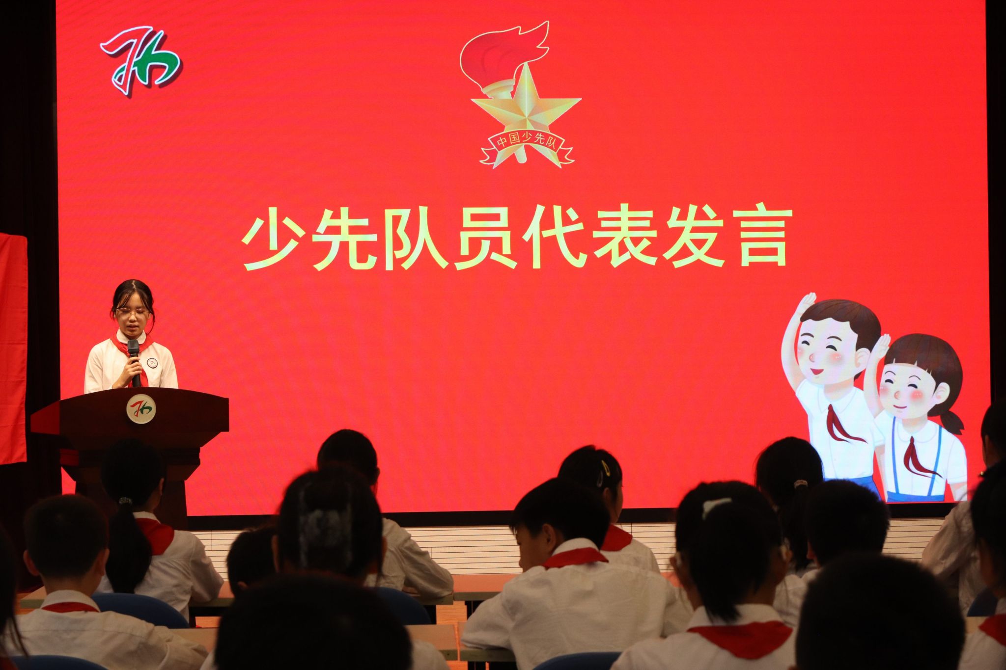 六(3)中队的王妤婕代表全体少先队员发言。她表示,换戴大号红领巾不仅意味着成长,更代表着肩上责任的加重。作为新时代少先队员,要用实际行动为红领巾增添新的光彩。她真挚有力的话语引发了在场队员的共鸣。