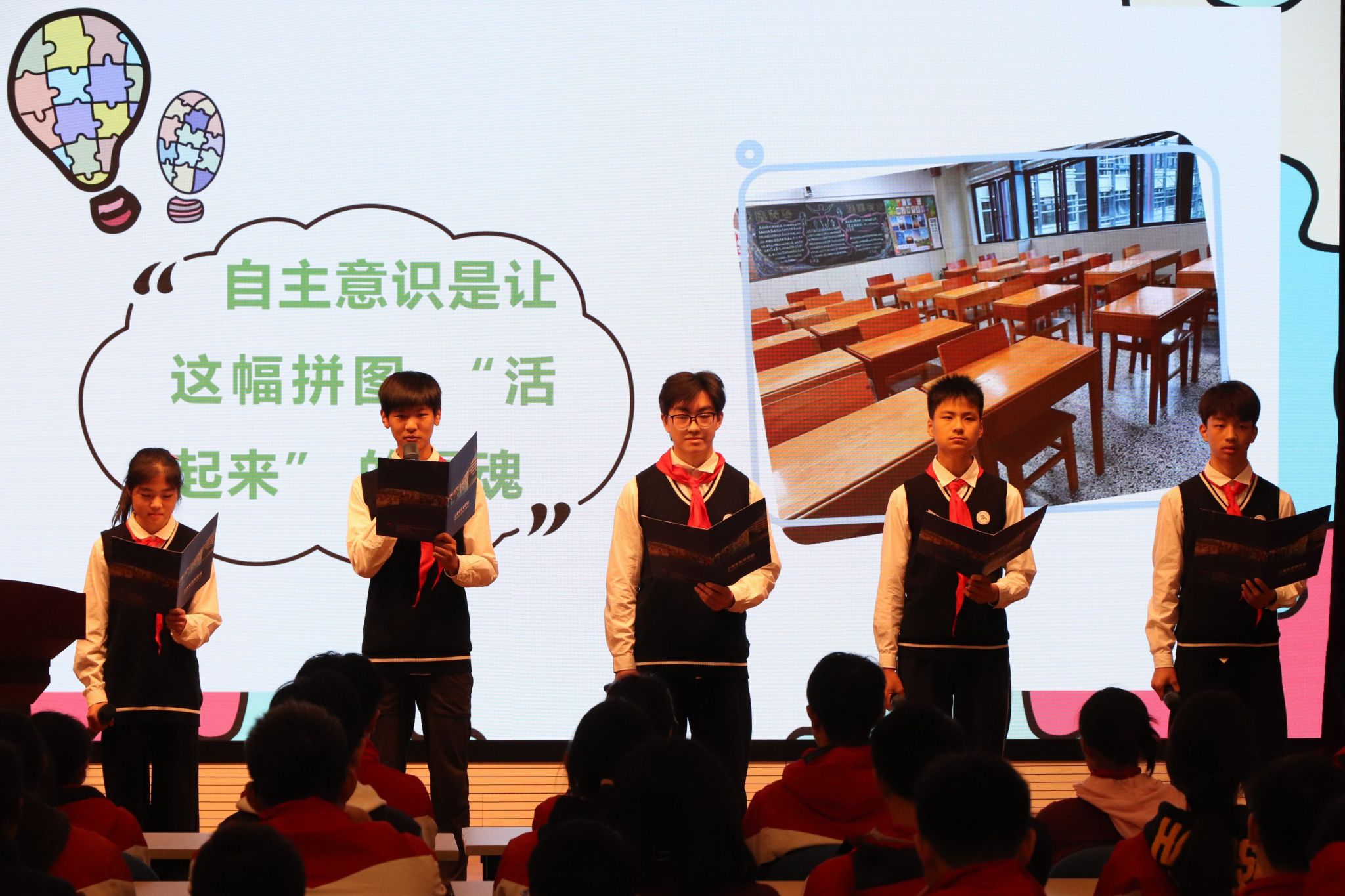 九(2)中队同学代表们以《劳动“拼图”——我们这样拼出最美教室》为题,讲述了他们用集体的力量与汗水,将一块块劳动的“拼图”精心构筑成温馨美好的学习家园的过程,证明了劳动能够凝聚人心、美化环境。