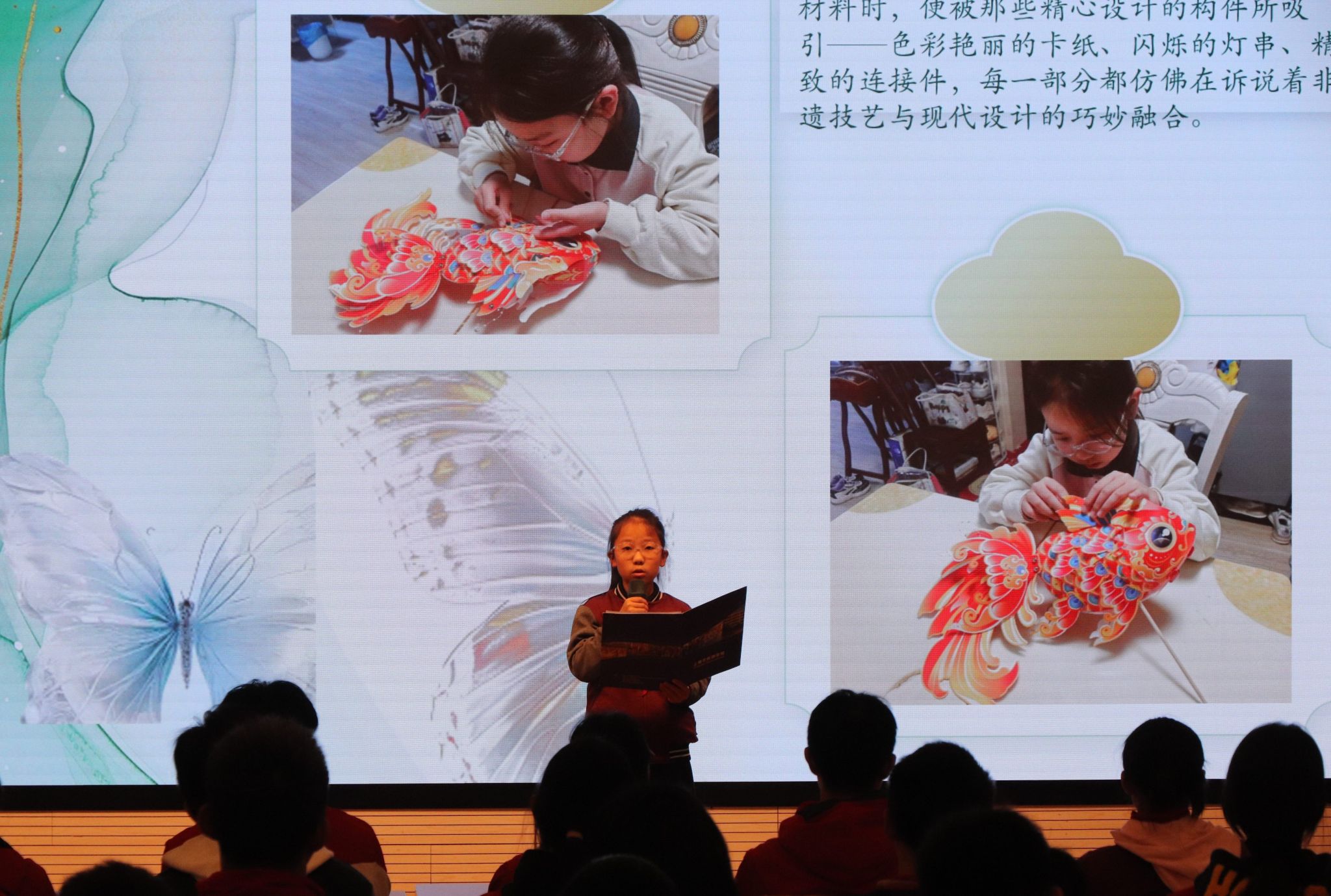 紧接着,五(1)中队熊何钰灵同学带来的“巧手制鱼灯”展示。她将传统工艺与童心巧思完美融合,精心制作鱼灯的过程,凝聚的不仅是耐心与细心,也是一份传承文化的匠心,是劳动在指尖焕发出的光彩。
