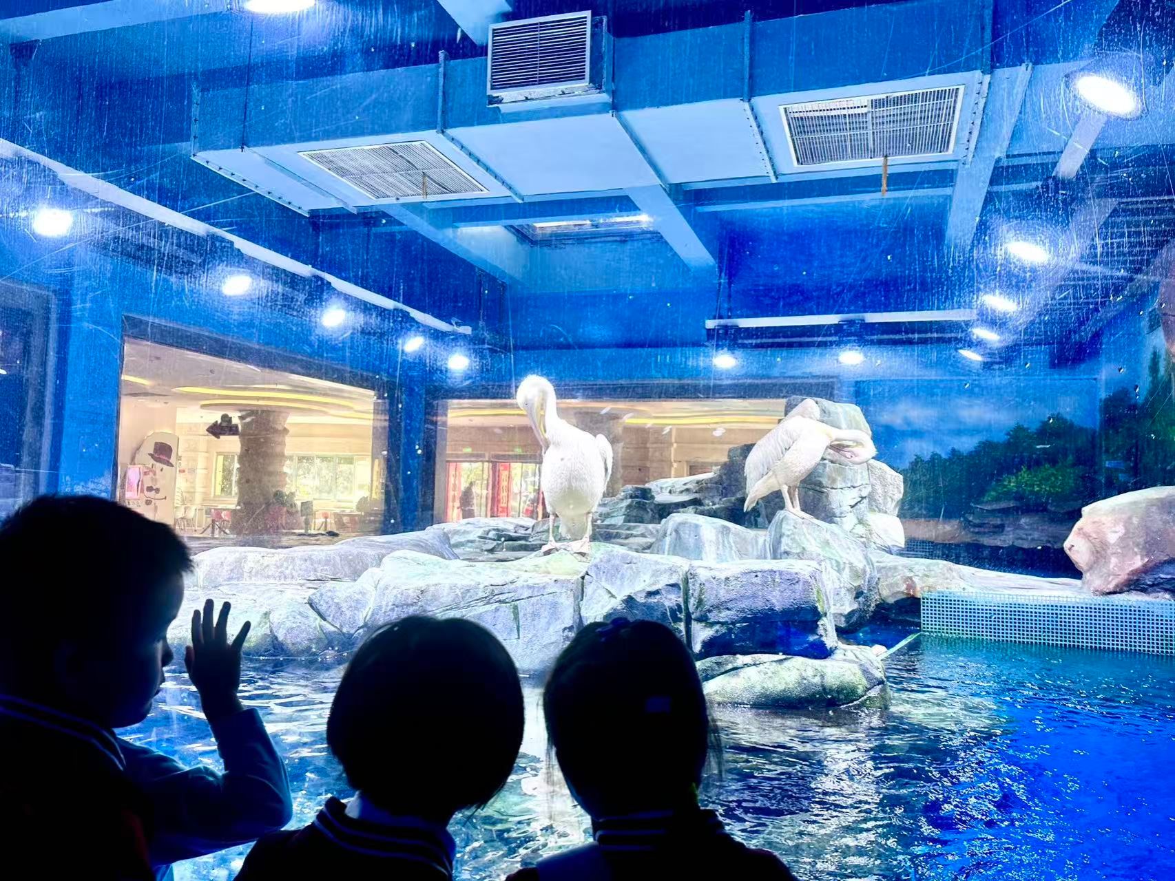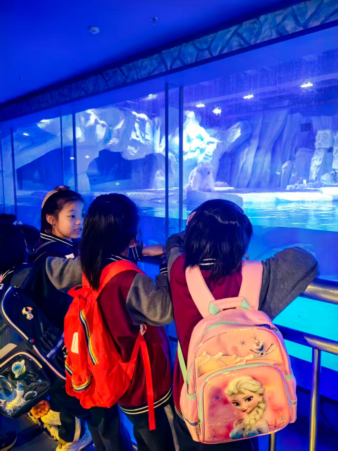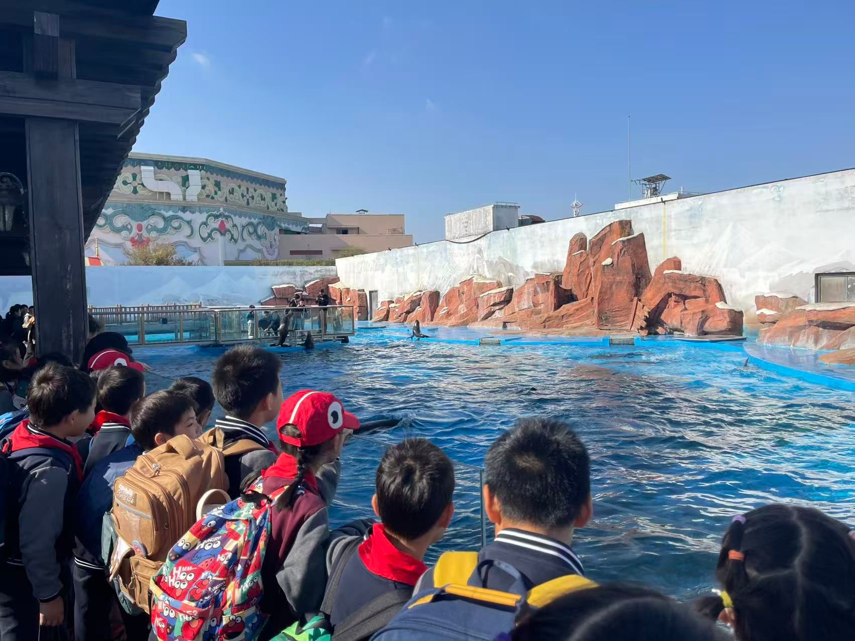 与此同时,小学的同学们满怀好奇,在上海海昌海洋公园开启海洋探秘之旅。一进公园,大家便迫不及待地穿梭在各个主题场馆:热带雨林馆里,色彩斑斓的热带鱼在珊瑚礁间游弋,像撒在水中的彩色宝石;极地动物馆中,憨态可掬的企鹅摇摆着身子“迎接”大家,圆滚滚的海豹在水里灵活翻转,时不时探出头与同学们互动——每一个灵动身影都让大家驻足惊叹。“企鹅的脚为什么不怕冷?”“海豹在水里怎么呼吸?”一连串疑问在场馆里响起,随着讲解员的耐心解答,海洋动物的生存智慧渐渐清晰。