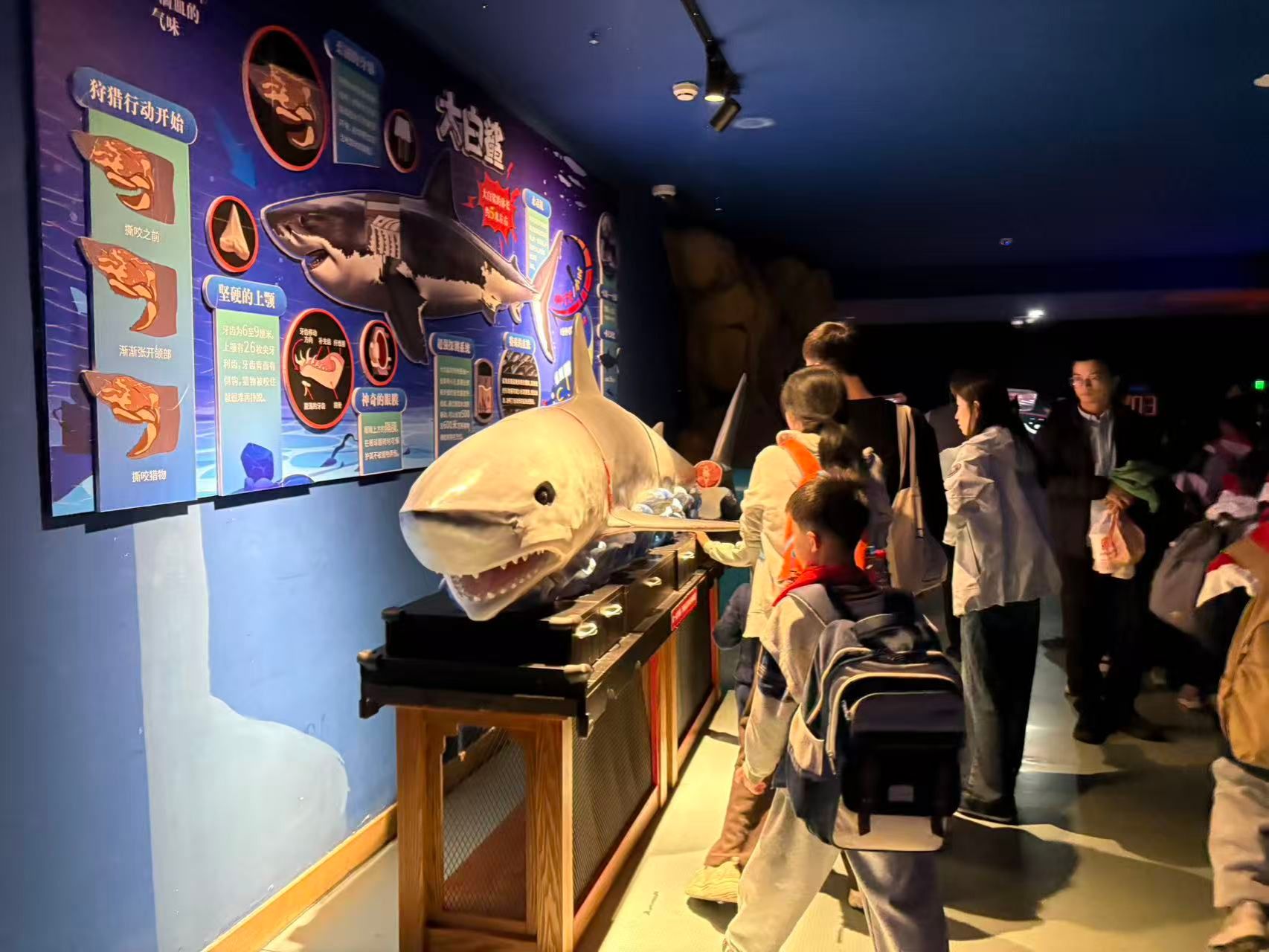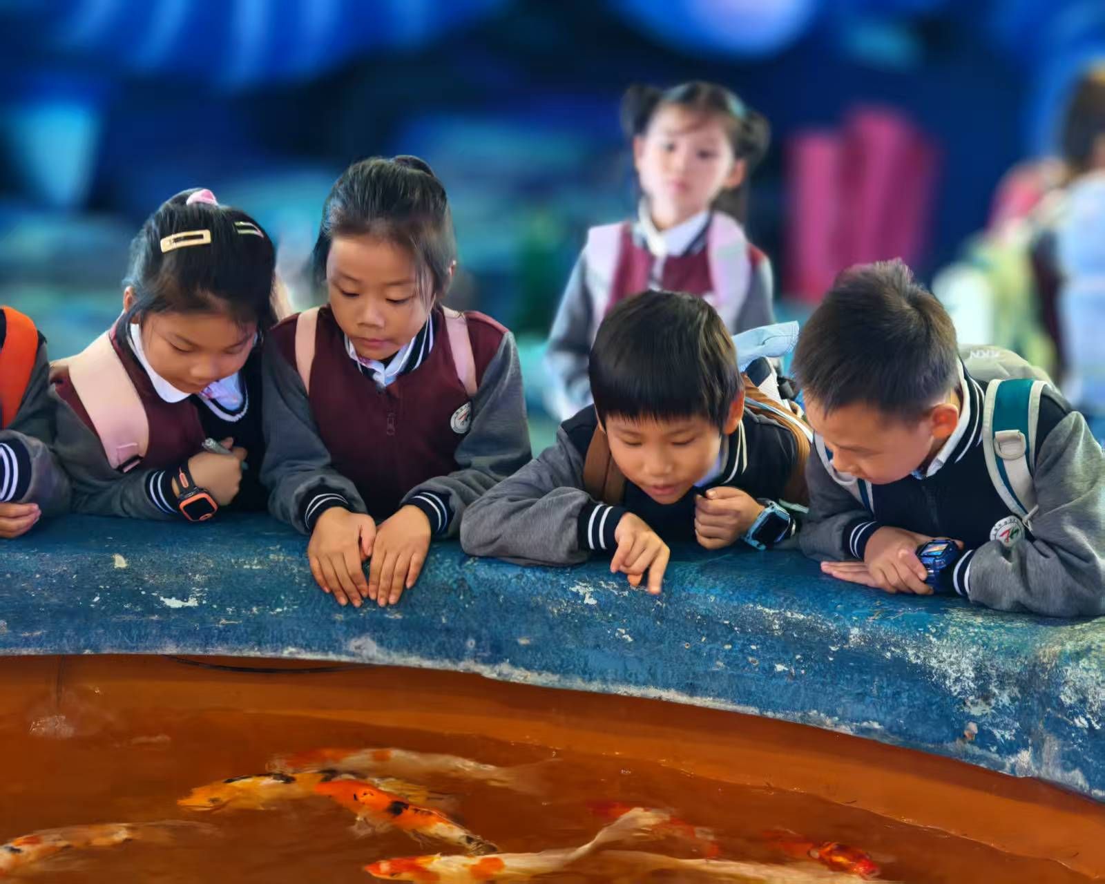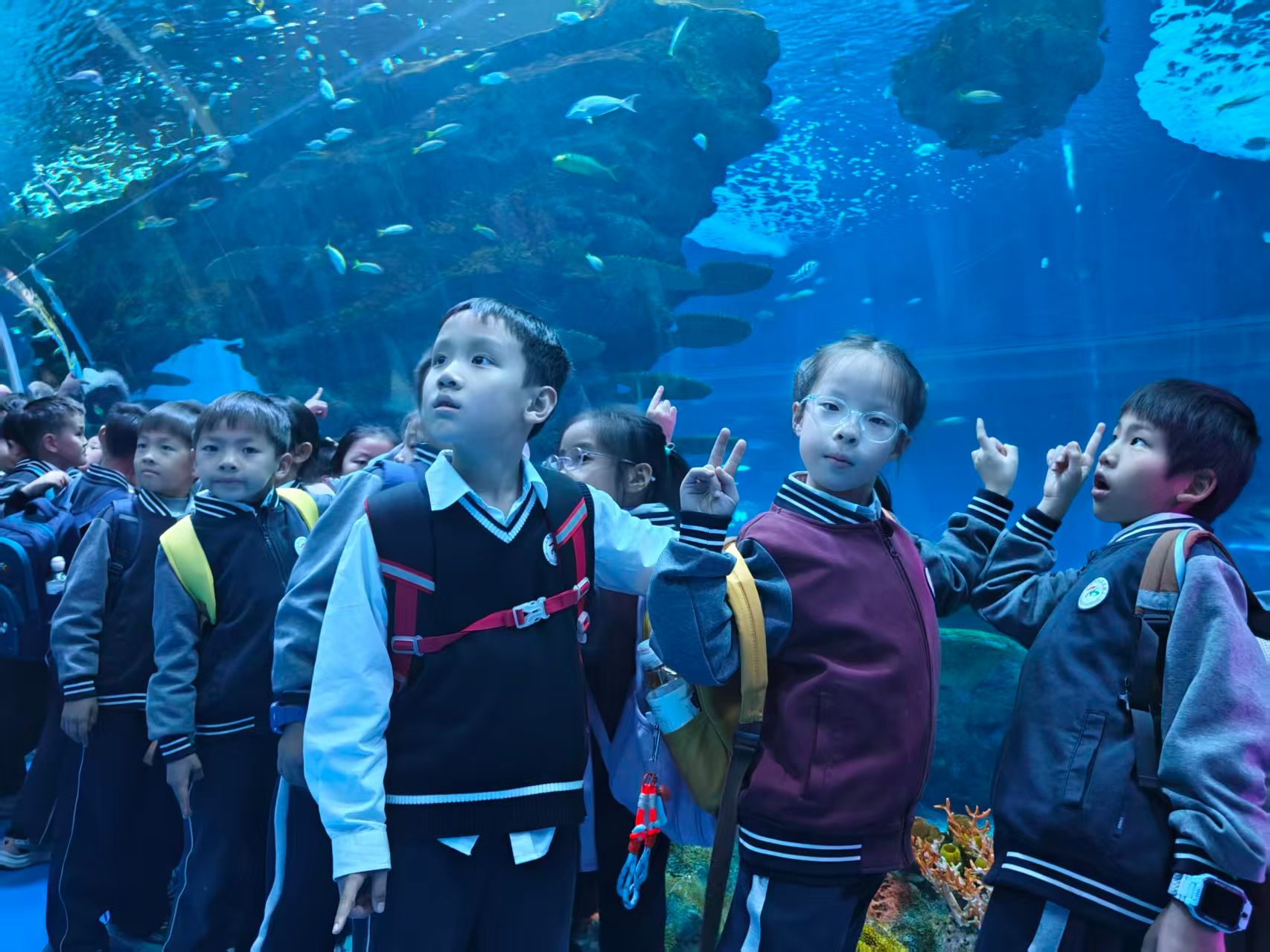 与此同时,小学的同学们满怀好奇,在上海海昌海洋公园开启海洋探秘之旅。一进公园,大家便迫不及待地穿梭在各个主题场馆:热带雨林馆里,色彩斑斓的热带鱼在珊瑚礁间游弋,像撒在水中的彩色宝石;极地动物馆中,憨态可掬的企鹅摇摆着身子“迎接”大家,圆滚滚的海豹在水里灵活翻转,时不时探出头与同学们互动——每一个灵动身影都让大家驻足惊叹。“企鹅的脚为什么不怕冷?”“海豹在水里怎么呼吸?”一连串疑问在场馆里响起,随着讲解员的耐心解答,海洋动物的生存智慧渐渐清晰。