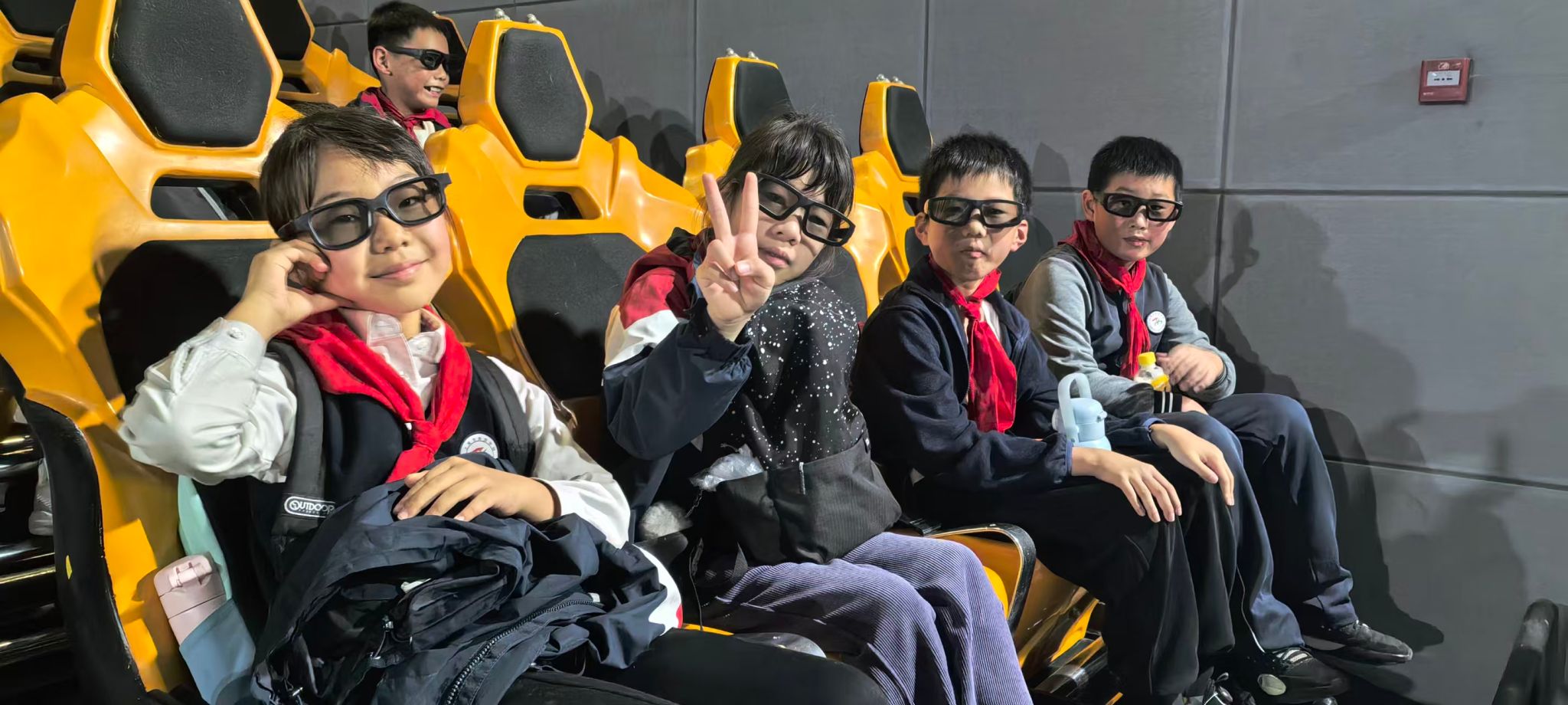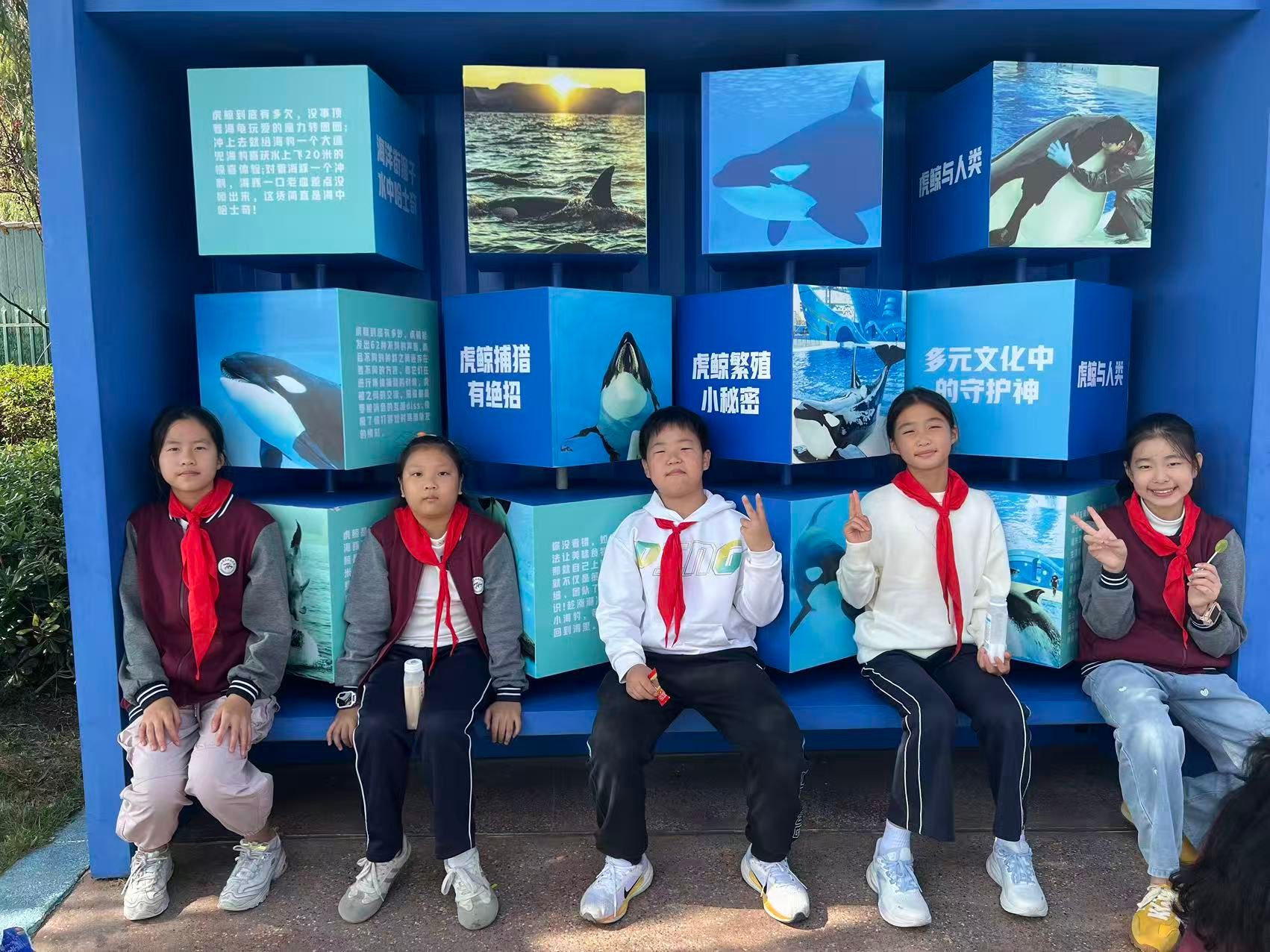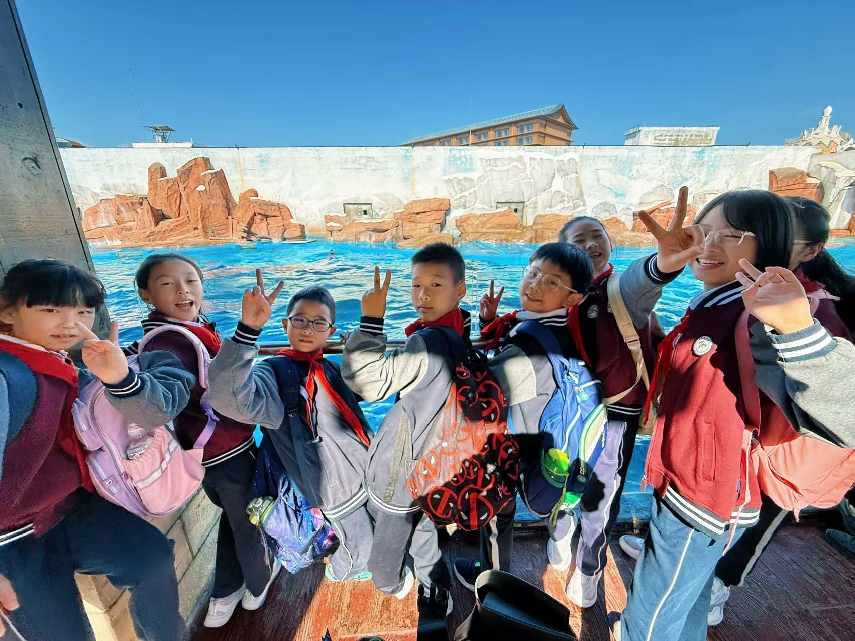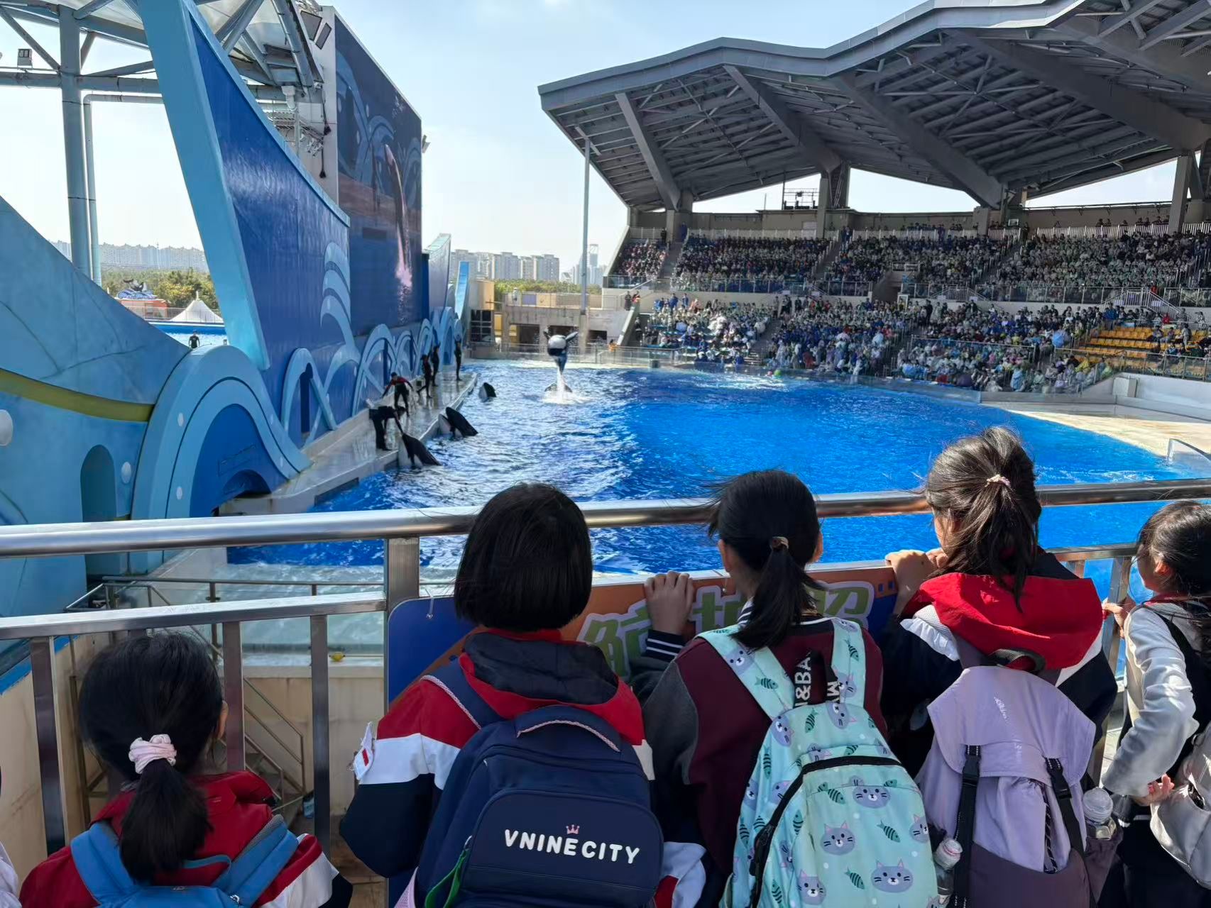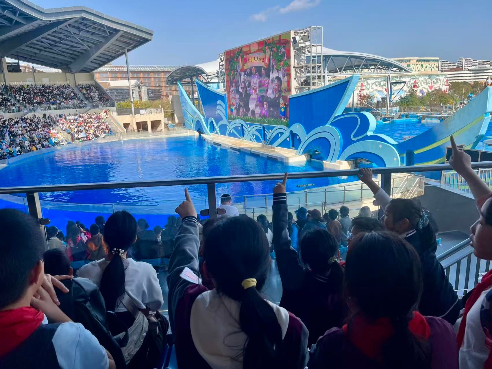 海洋剧场与4D影院的体验更是让同学们大呼过瘾。海洋剧场内,海豚跃出水面划出优美弧线,与驯养师默契配合完成高难度动作;虎鲸巨大的身躯在水中灵活翻转,溅起的水花引发全场欢呼,它们的聪明与力量让人深深折服;海狮顶着彩球转体的模样,逗得大家笑声不断。最动人的是“美人鱼”表演,演员们在湛蓝水中与鱼群共舞,演绎着保护海洋的故事,悄悄在孩子们心中种下守护自然的种子。走进4D影院,戴上特制眼镜,同学们仿佛“穿越”到深海,与海洋生物近距离“互动”,切身感受着海洋的神奇与壮阔。整个游览过程中,大家一边欣赏动物演出、观察海洋生物,一边在研学单上认真记录发现与感受,彼此分享着研学的快乐。