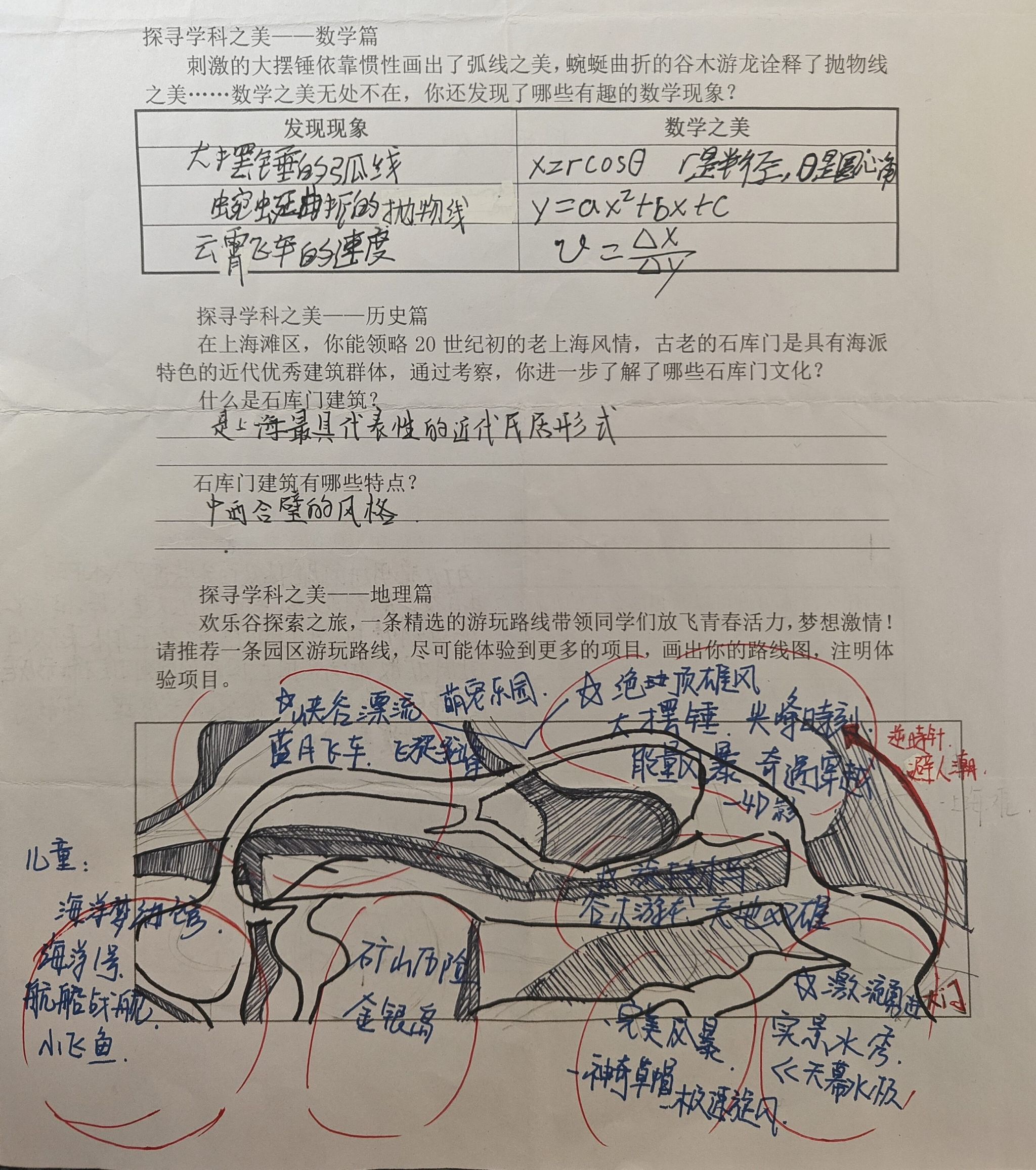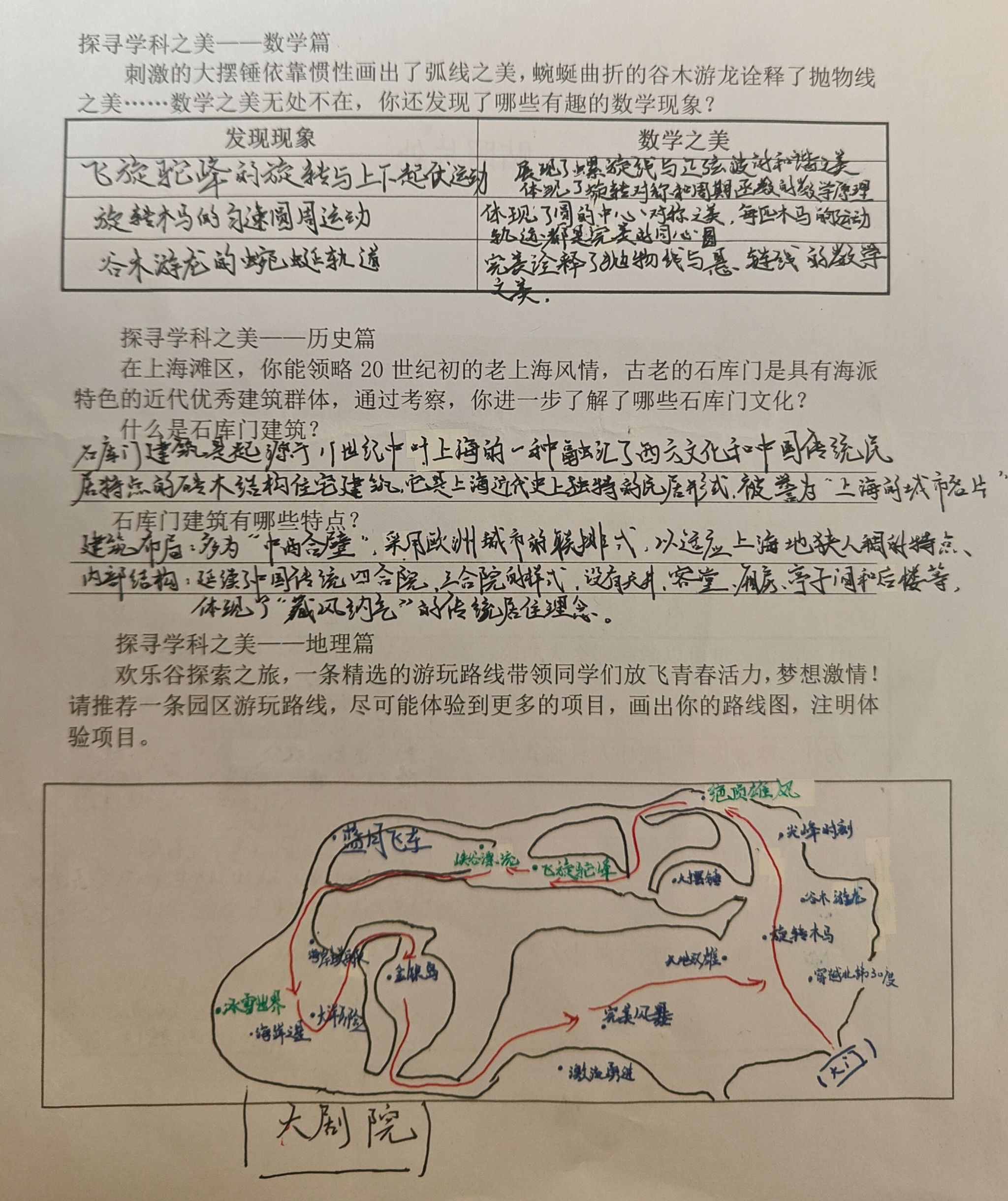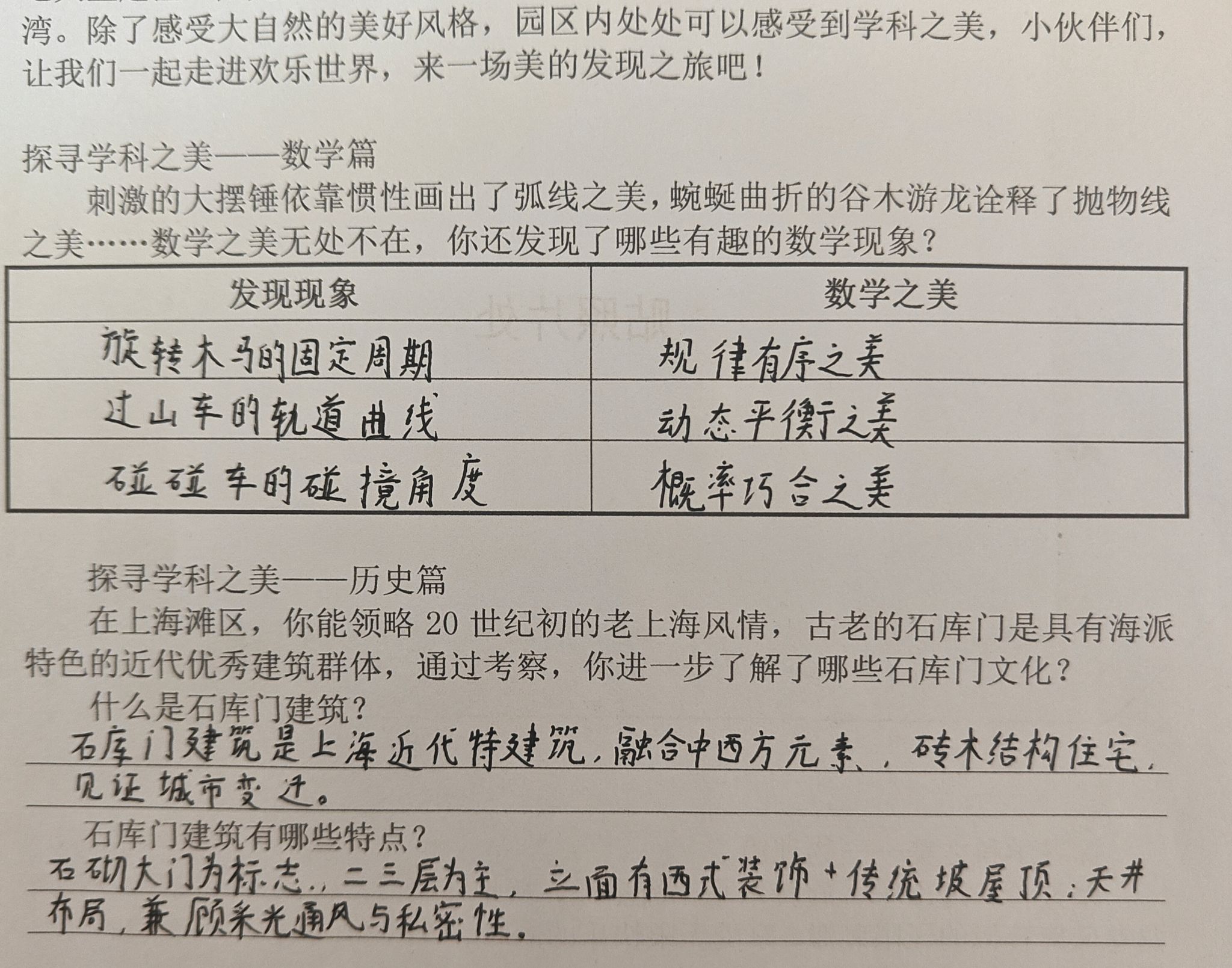 中学的同学们带着“研学之旅作业单”,走进了坐拥七大主题区、百余项体验项目的欢乐王国——欢乐谷。在老师的引导下,各班迅速分组。作业单上“数学之美”“历史之韵”“地理之智”“美术之趣”“物理之奇”五大探究方向,成了大家最有趣的“任务卡”。寻数学之美时,有人盯着摩天轮的匀速转动,笔尖记下“圆心角变化规律”;踏入“上海滩”主题区,复古电车的叮当声、青砖黛瓦的石库门瞬间拉满氛围感,大家踮脚观察门楣雕花,轻声交流“石库门为何是海派文化符号”,历史的韵味悄悄浸润心间……