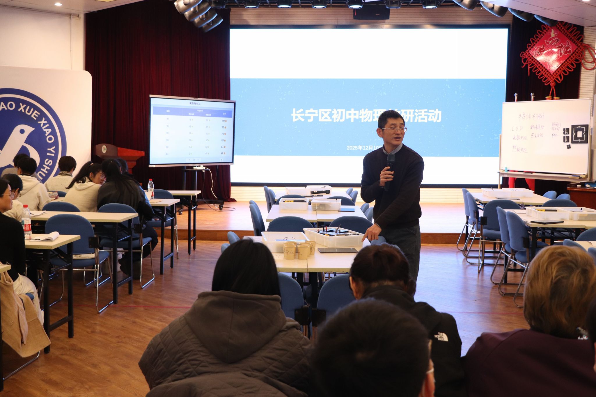 评课环节由区物理教研员王玉钊老师主持,现场研讨氛围热烈。首先,秦琴琴老师进行说课,详细阐述了本节课的设计思路——以“生活中的灯”为单元核心情境,串联电阻、欧姆定律与半导体应用知识,通过跨学科实践实现“物理观念、科学探究、科学态度与责任”的素养落地。