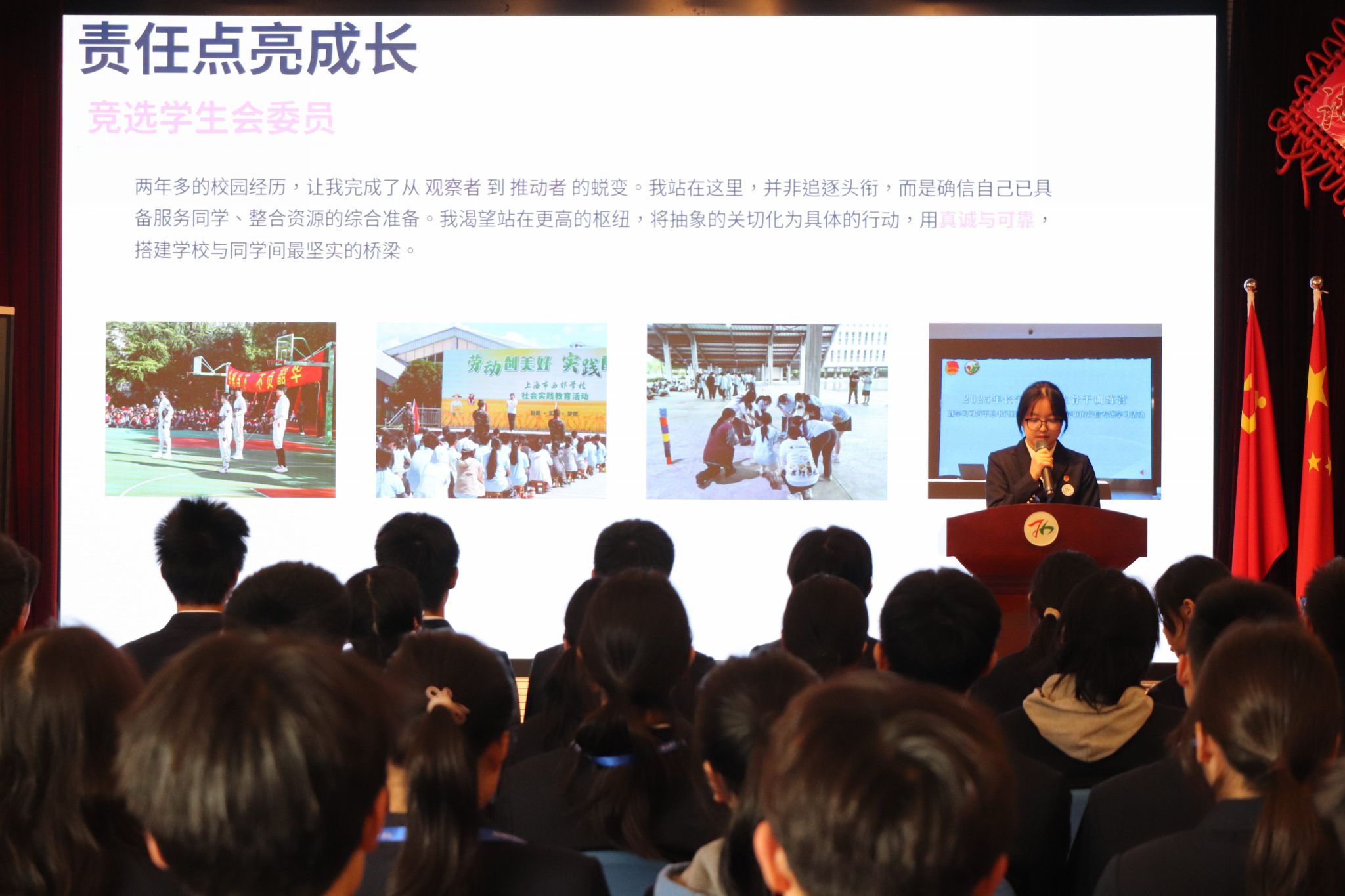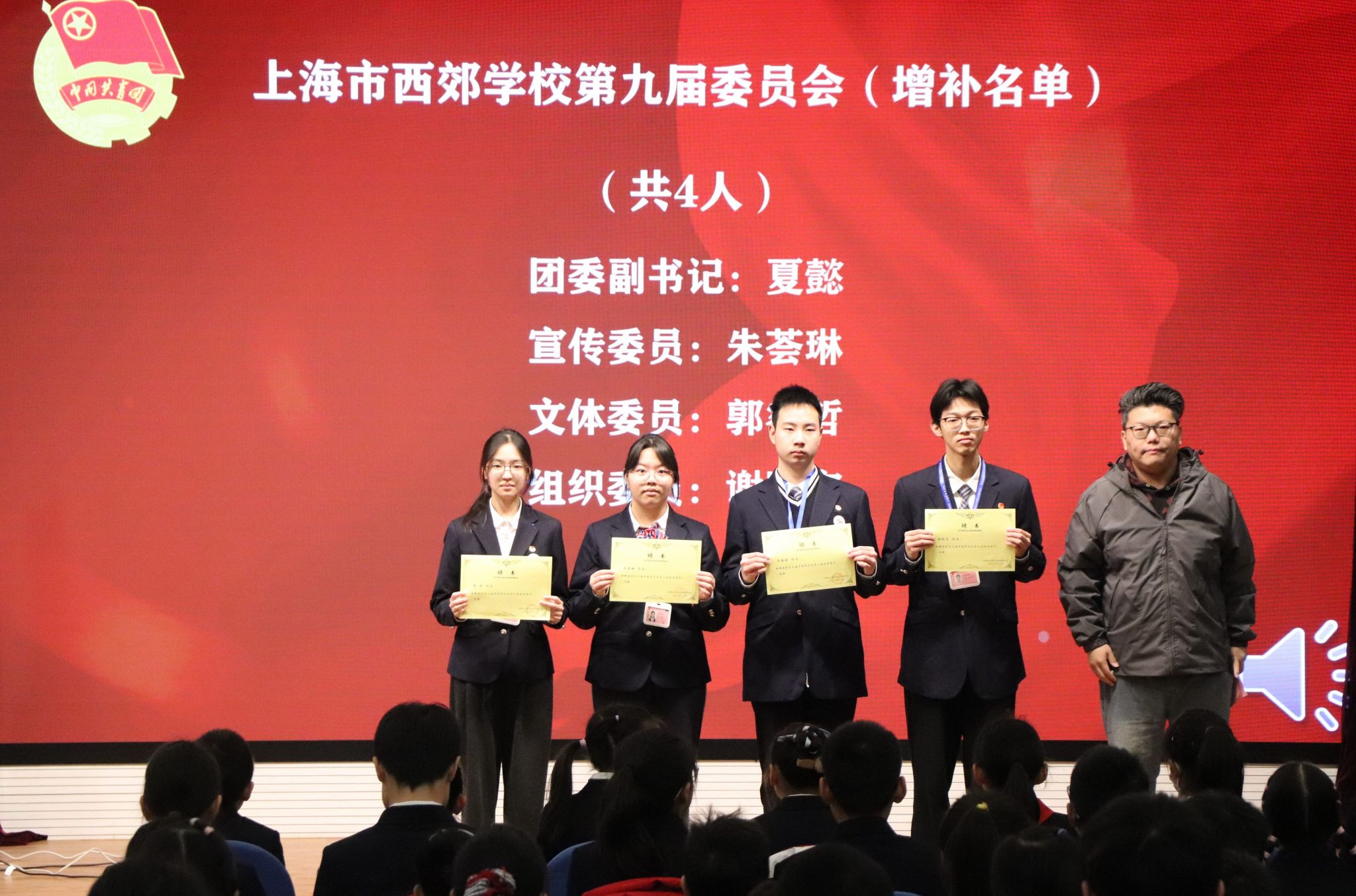 大会宣布了新一届团委、学生会、大队委员组成名单。学生发展中心主任顾寅老师为新当选的学生干部颁发证书和队标志。赵伟副校长为中队辅导员代表颁发聘书。校大队主席、校团委副书记作为学生干部代表发言,表达了不负信任、认真履职、勇于担当的决心,将以更加饱满的热情投入到工作中,带领同学们共同进步。