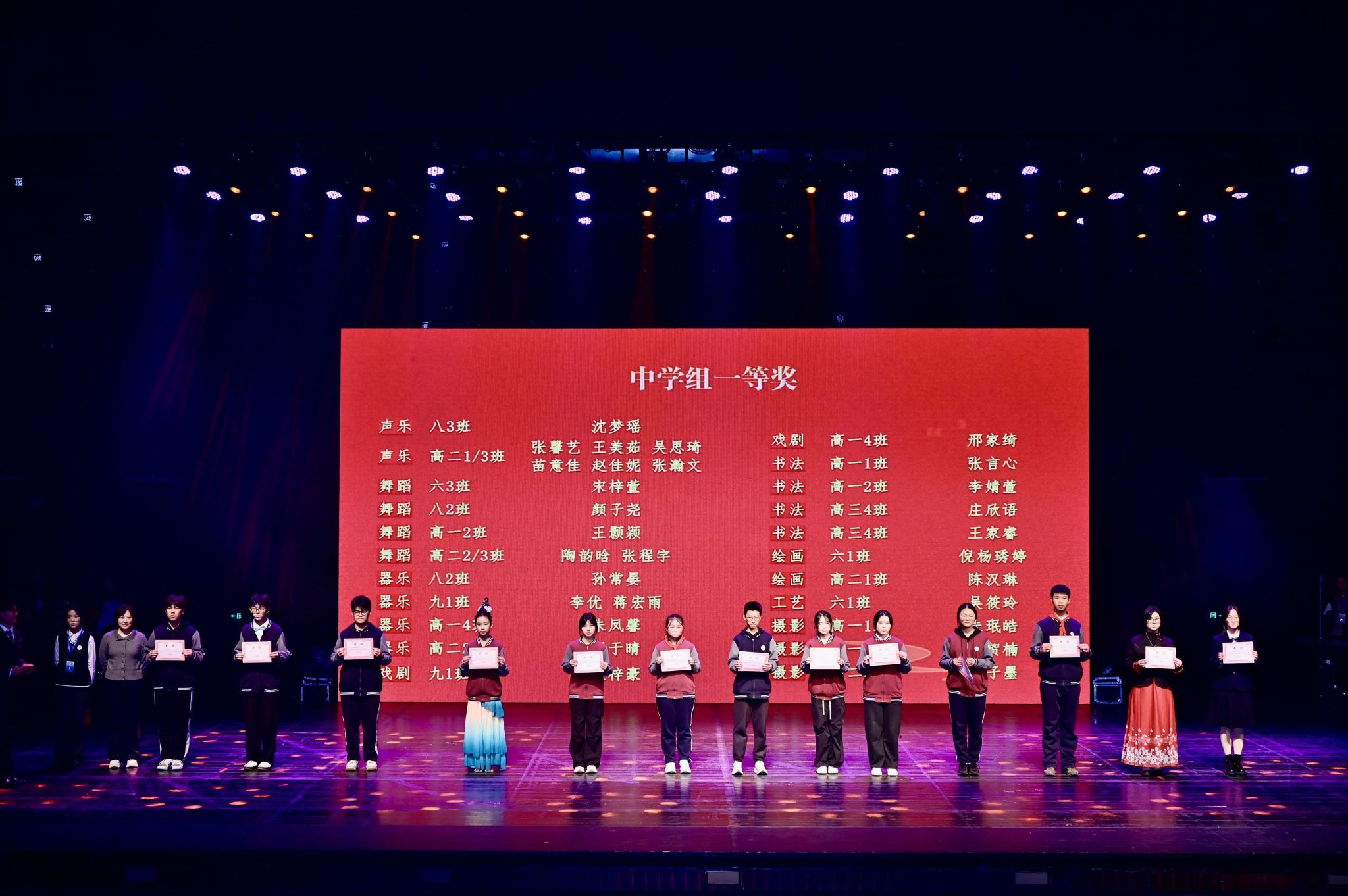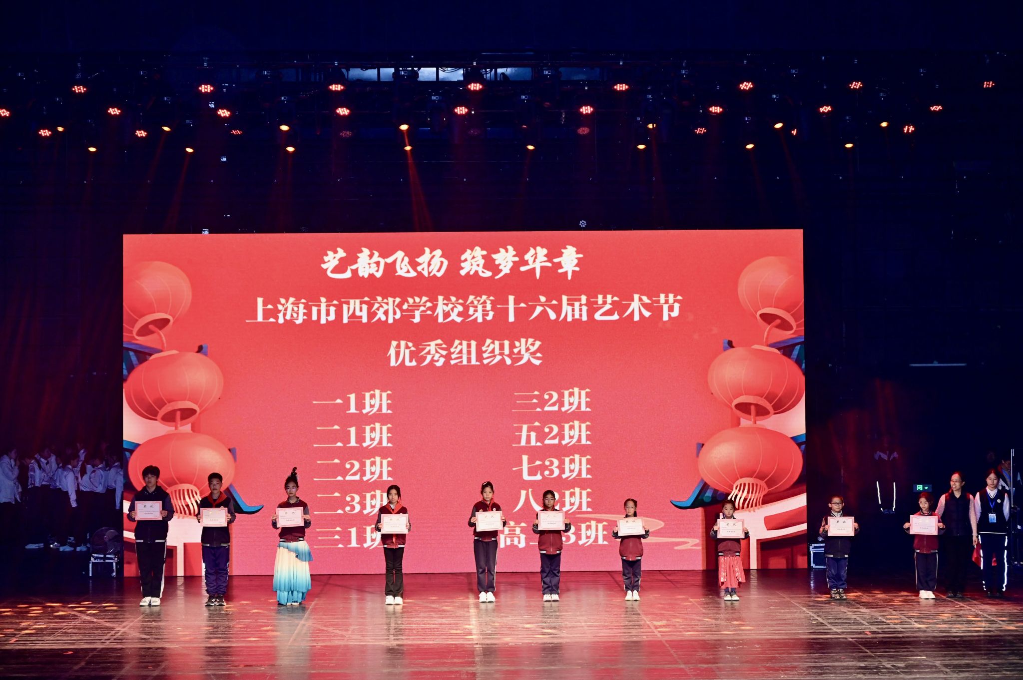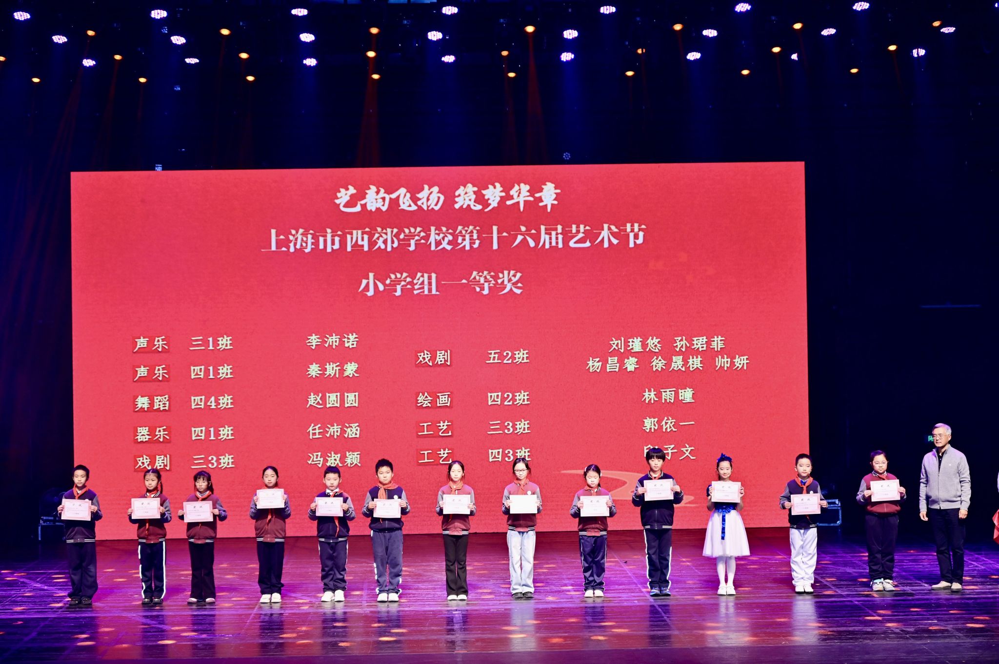 本届艺术节历时一个月,以八项艺术专场赛事为载体,点燃全校师生的艺术热忱。同学们踊跃参与、尽情展演,在竞技中展示才华,在舞台上绽放青春活力。颁奖仪式环节,表彰氛围热烈庄重:戚灵灵副校长为获得最佳组织奖的班级代表颁奖;赵伟副校长和章煜副校长分别为各专场比赛小学组和中学组一等奖获得者颁奖。一张张奖状承载着荣誉与认可,更凝聚着付出与成长,激励着西郊学子继续追寻艺术之美。