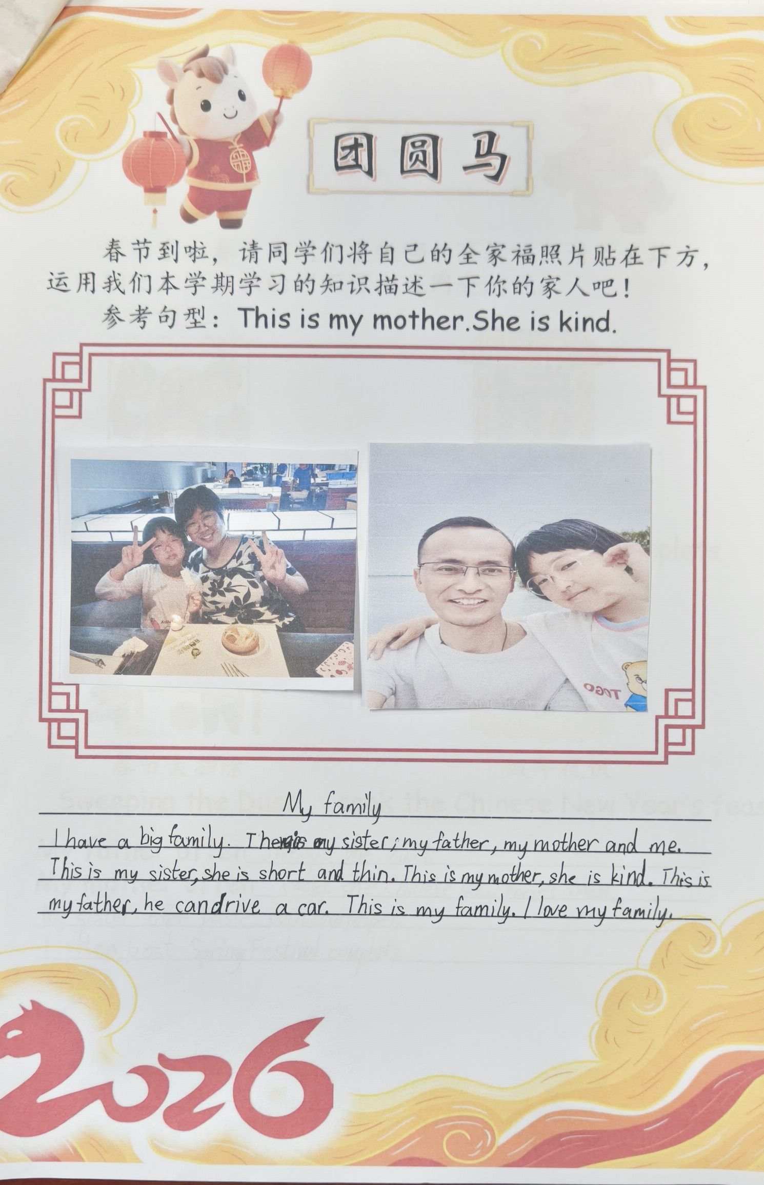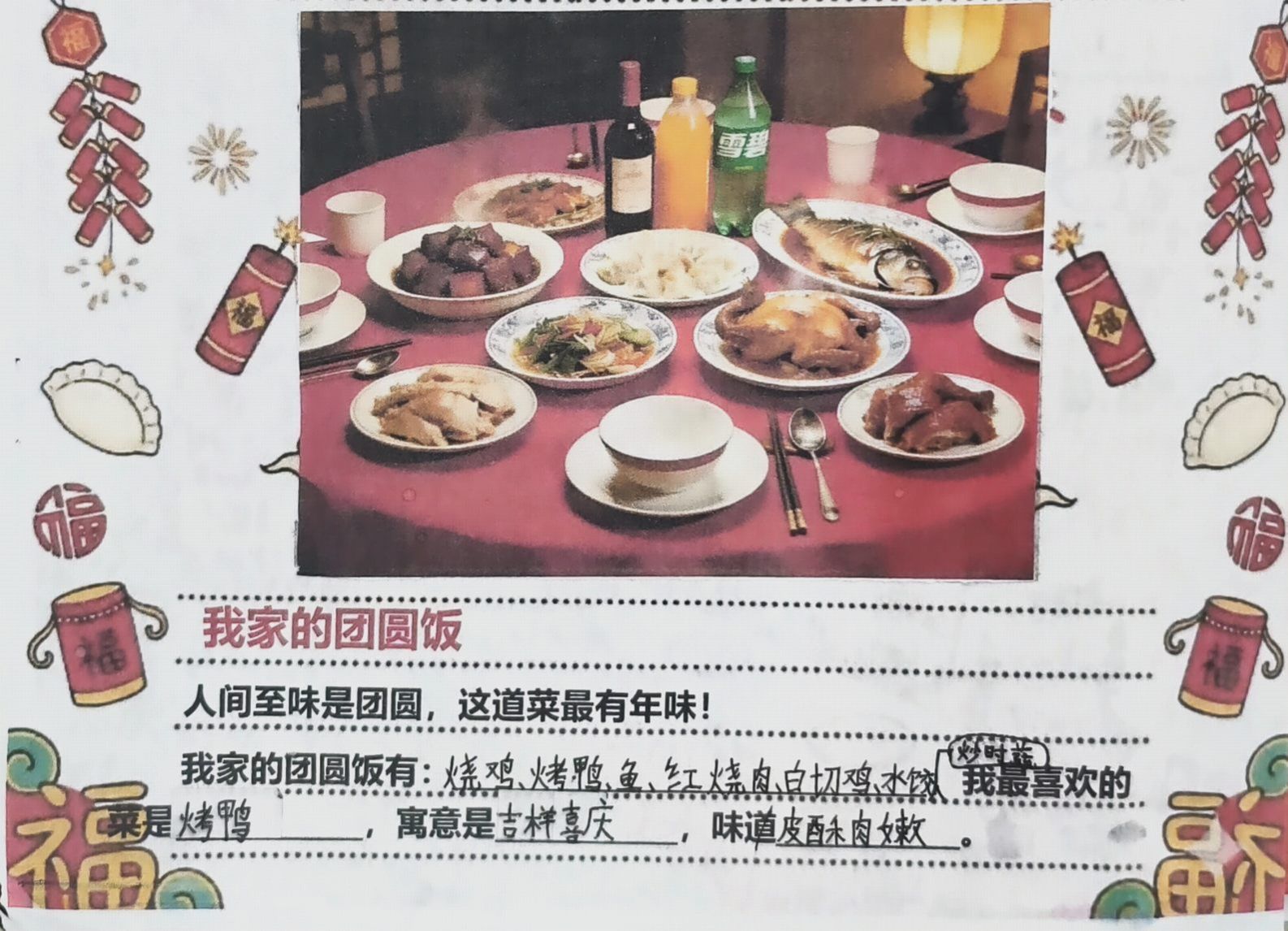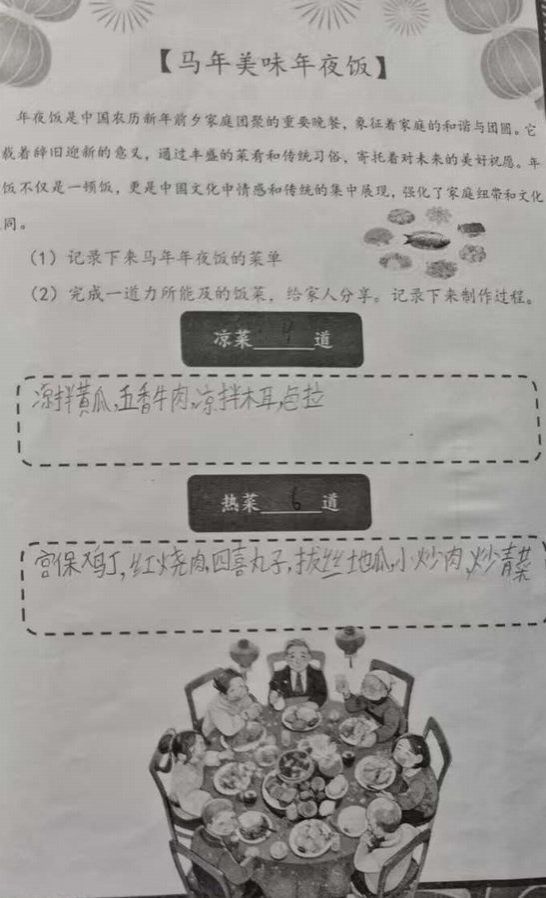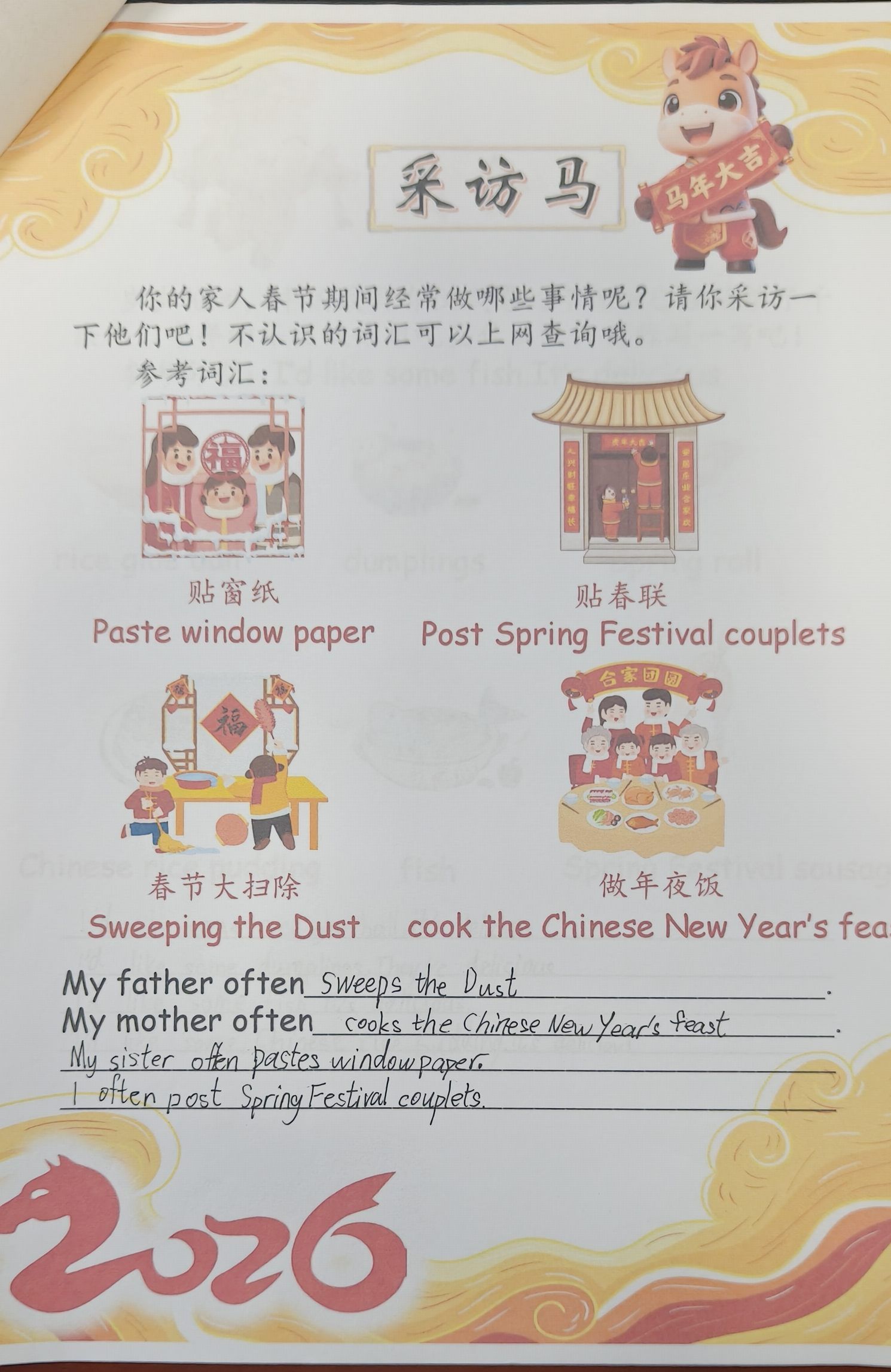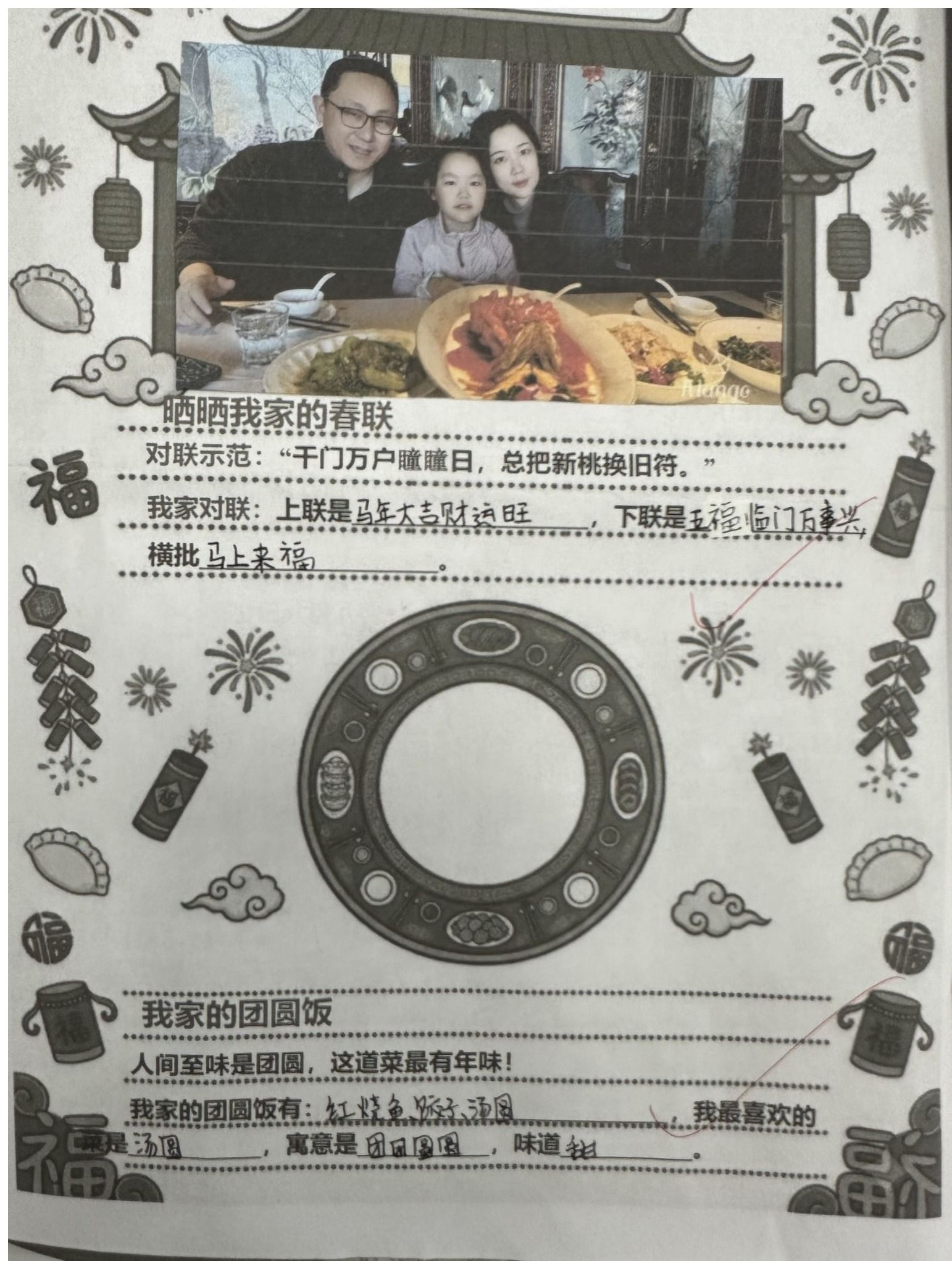 英语作业则聚焦“用英语讲好中国年”主题,借助介绍家庭树、模拟“年货大作战”采购场景运用购物用语,用英语描述年夜饭、开展春节习俗采访等活动,引导同学们在语言输出中传承中华文化,培养跨文化交际意识。