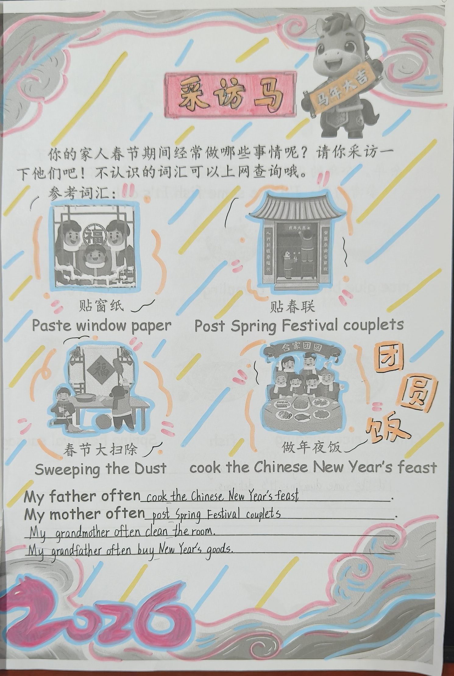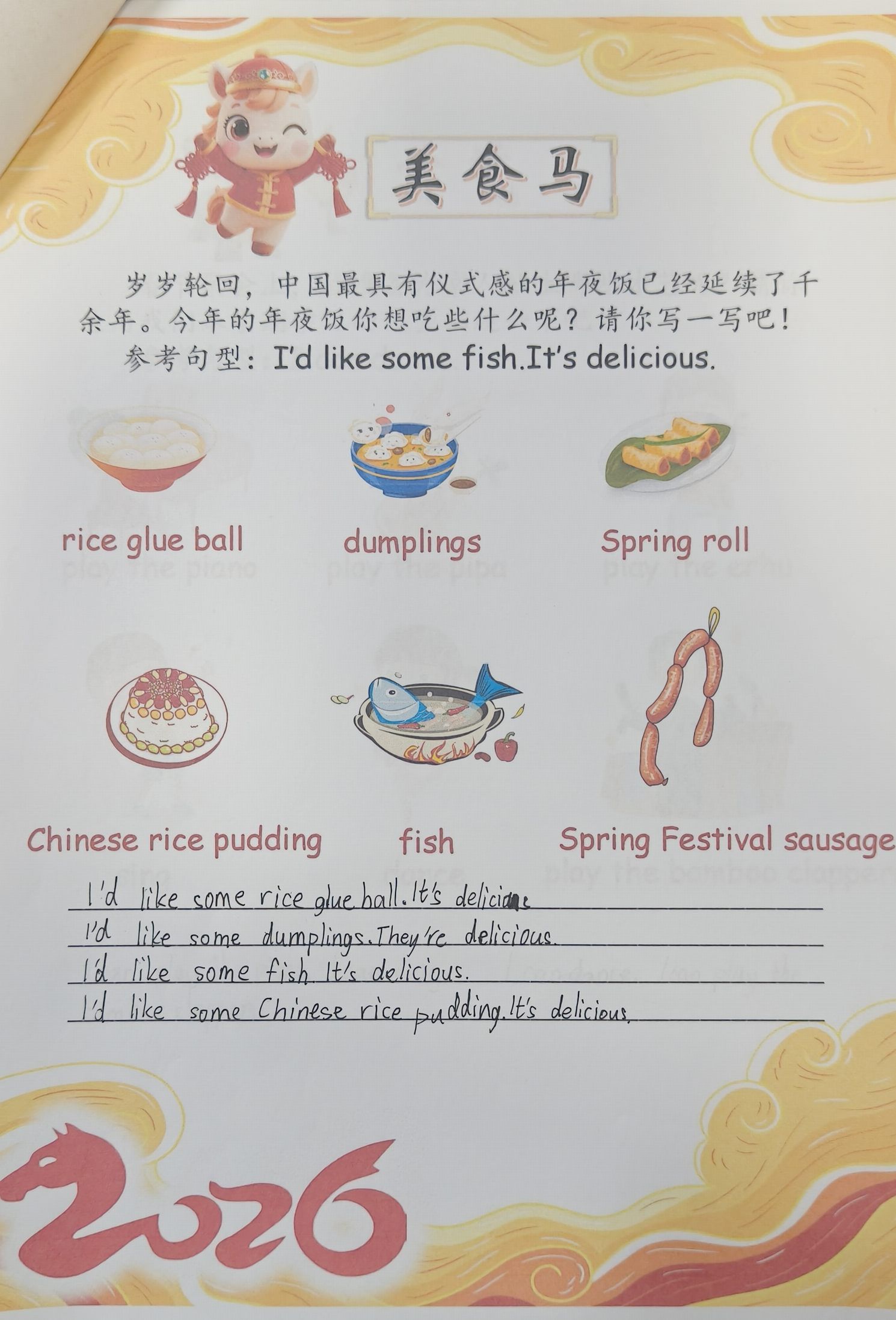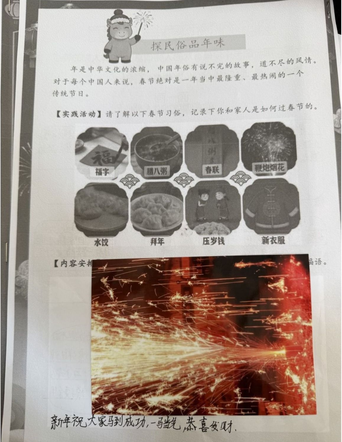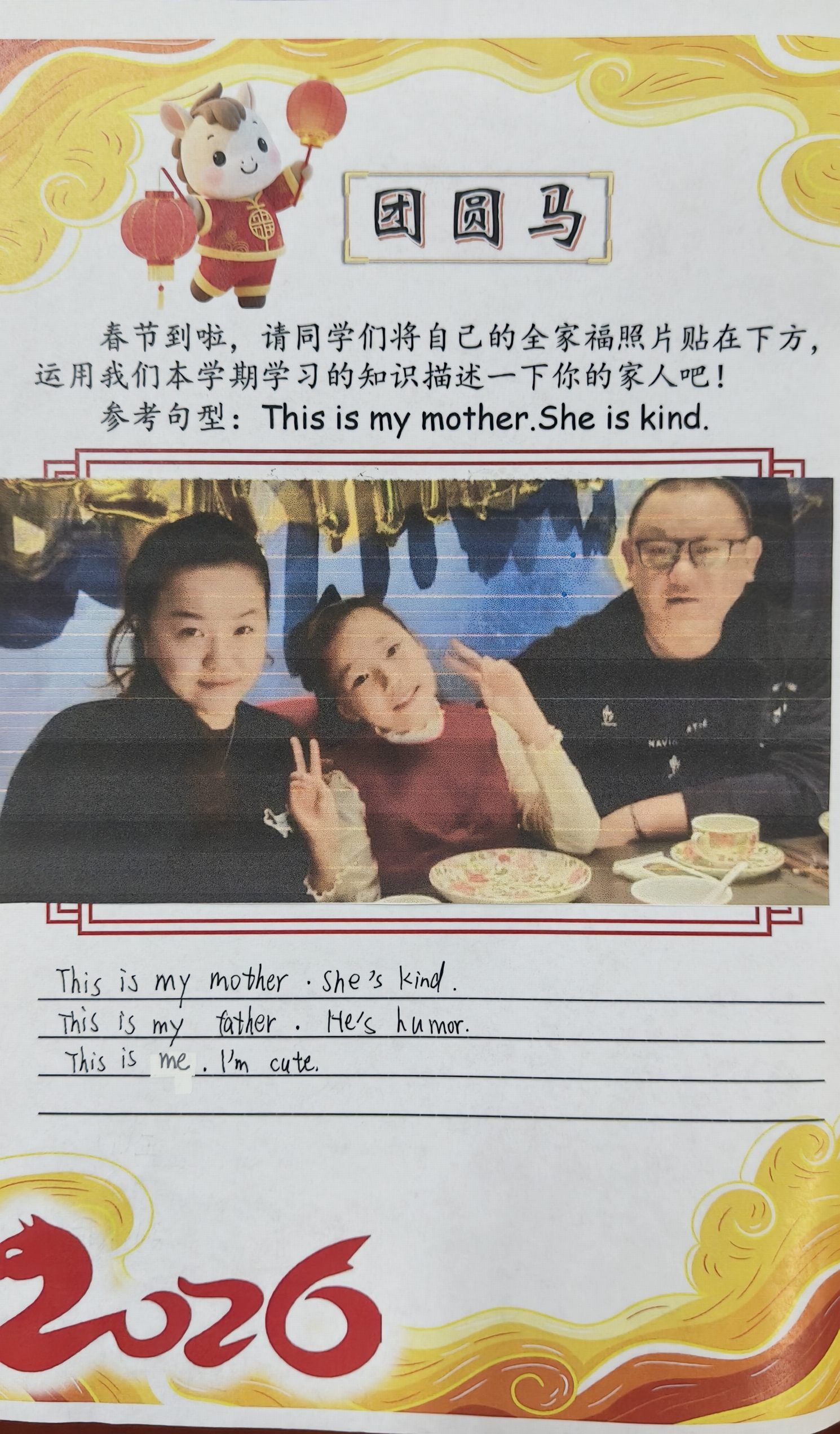 英语作业则聚焦“用英语讲好中国年”主题,借助介绍家庭树、模拟“年货大作战”采购场景运用购物用语,用英语描述年夜饭、开展春节习俗采访等活动,引导同学们在语言输出中传承中华文化,培养跨文化交际意识。