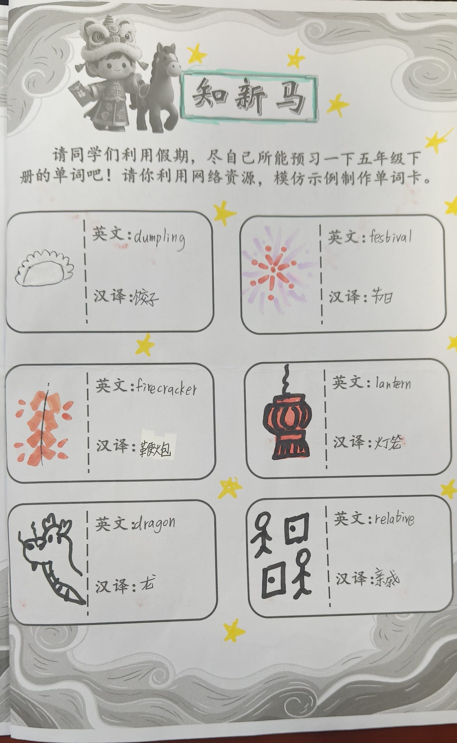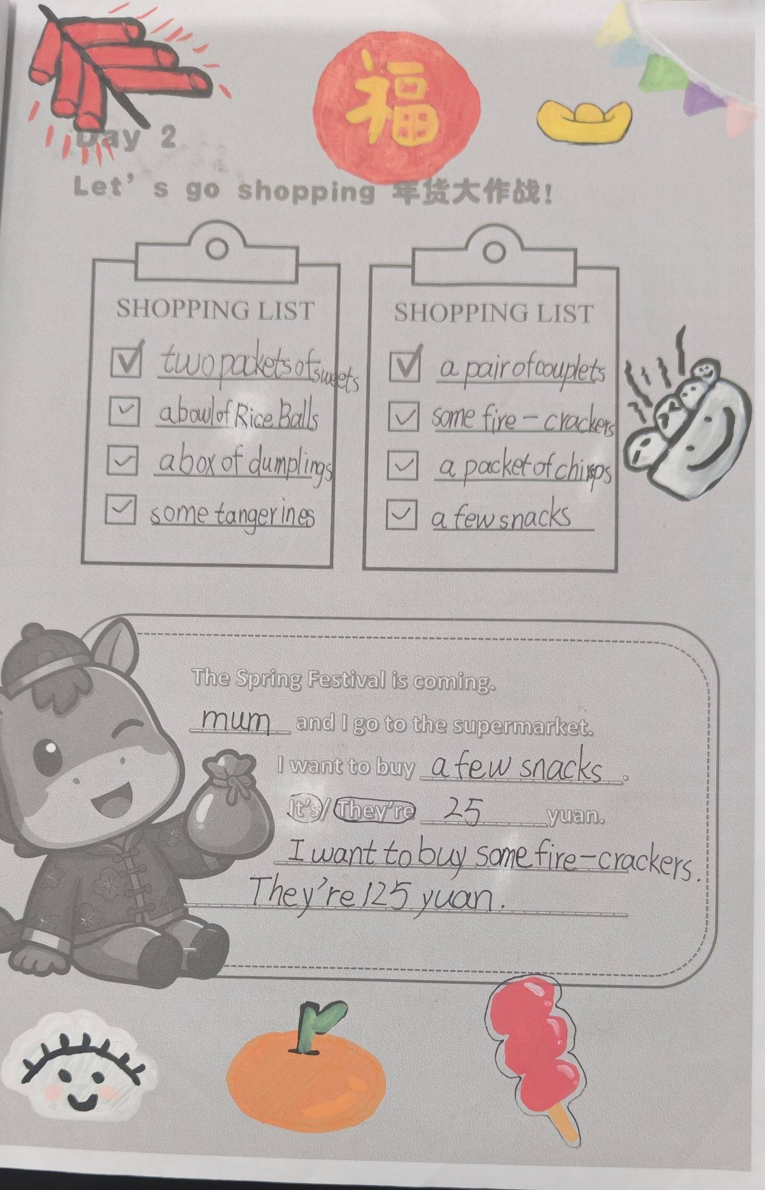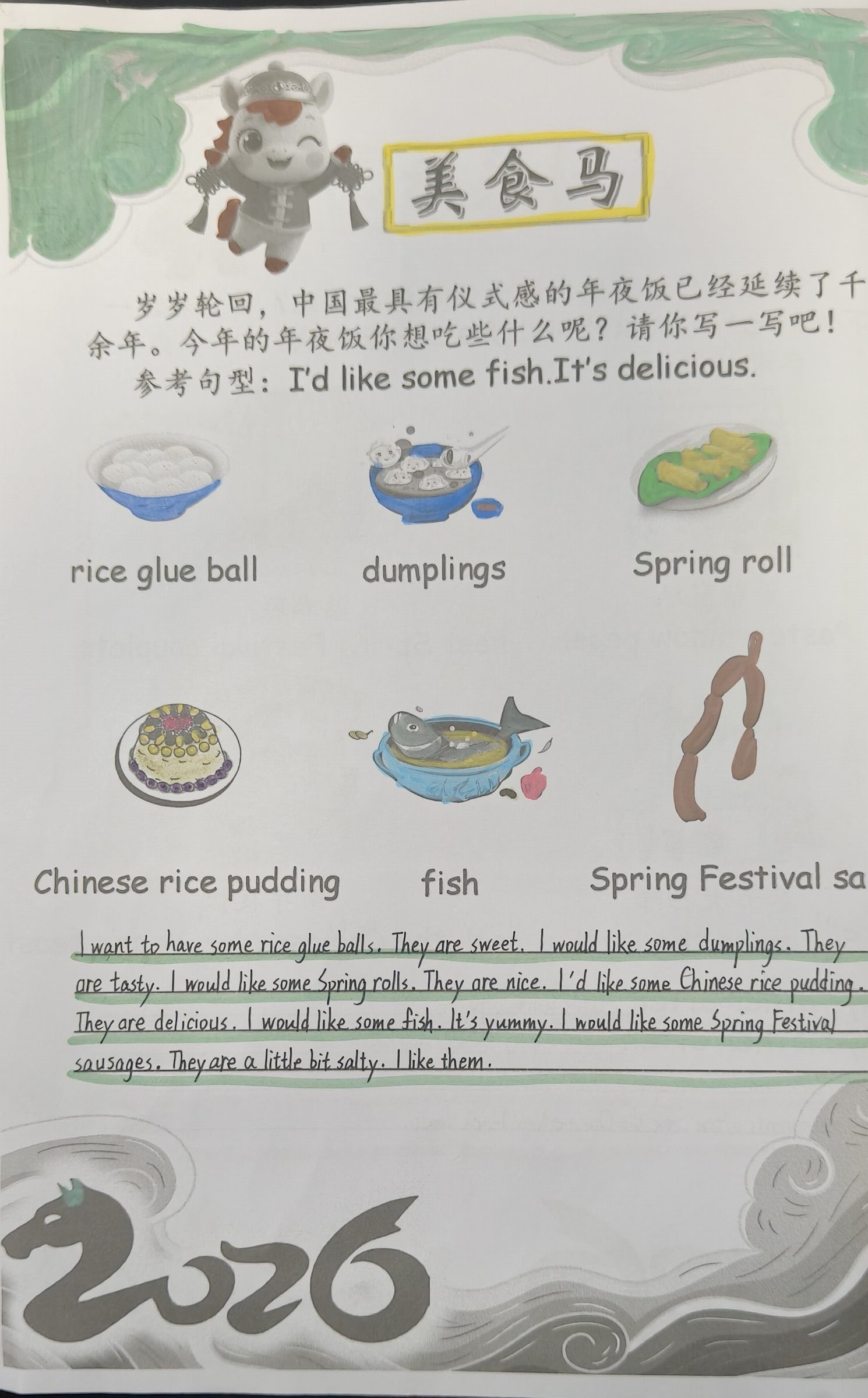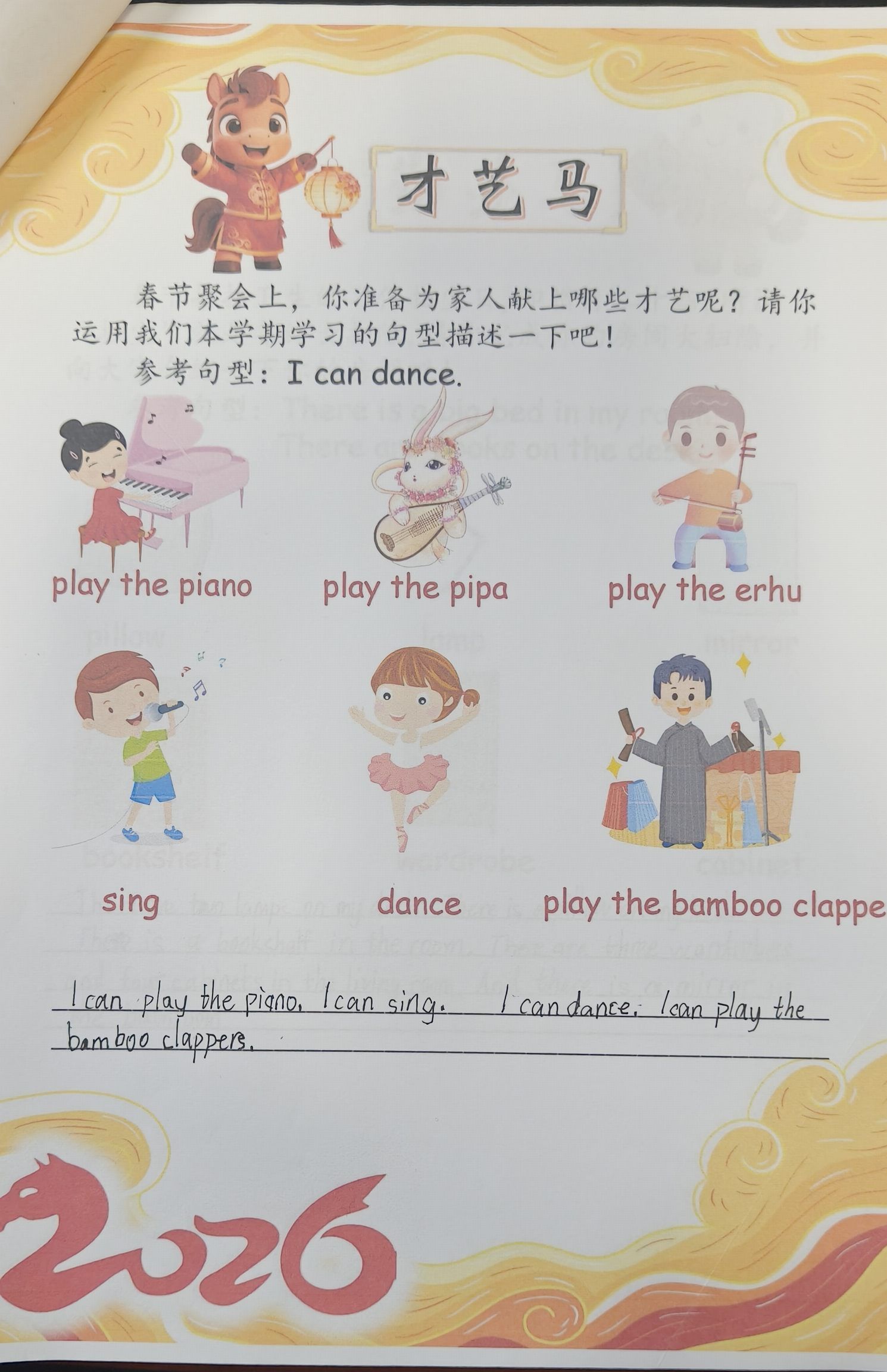 英语作业则聚焦“用英语讲好中国年”主题,借助介绍家庭树、模拟“年货大作战”采购场景运用购物用语,用英语描述年夜饭、开展春节习俗采访等活动,引导同学们在语言输出中传承中华文化,培养跨文化交际意识。