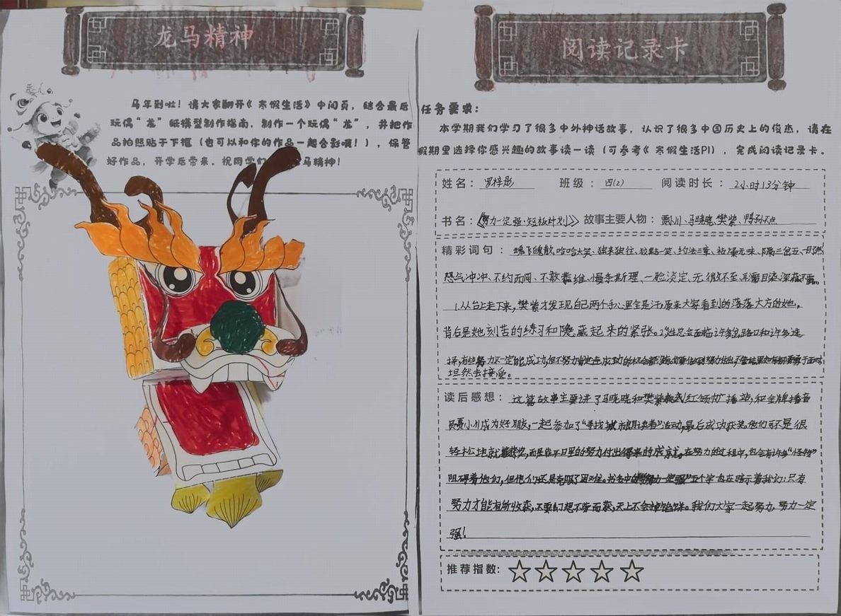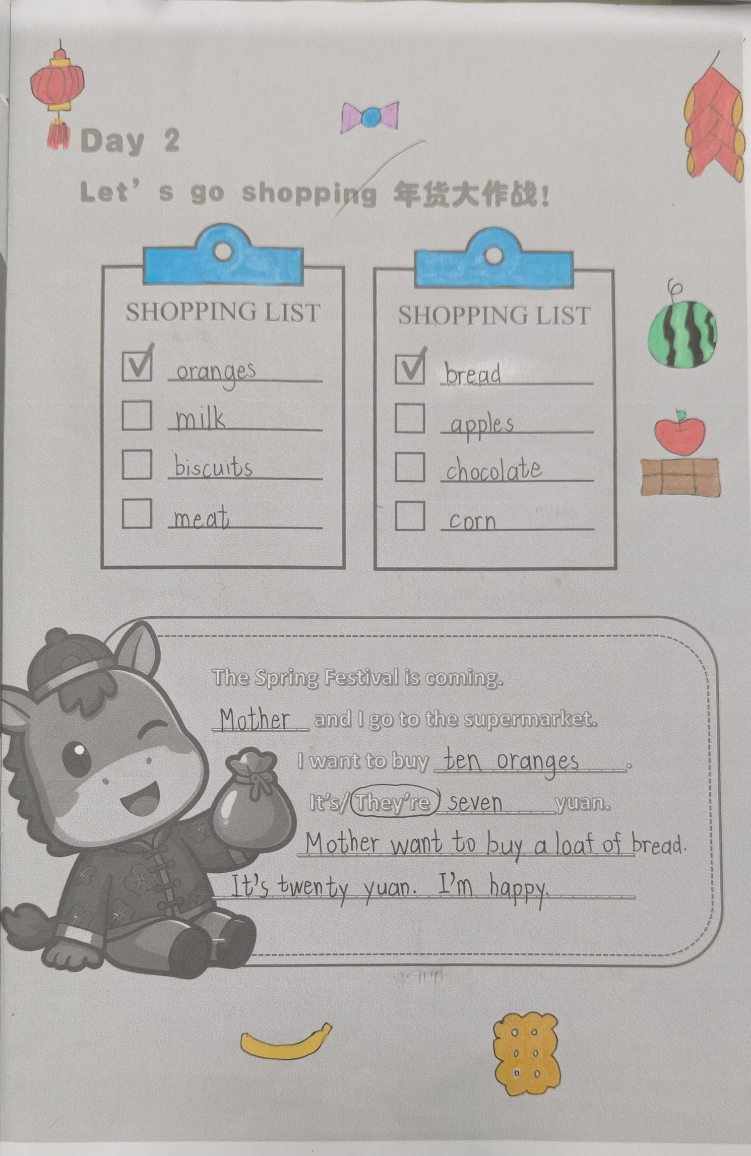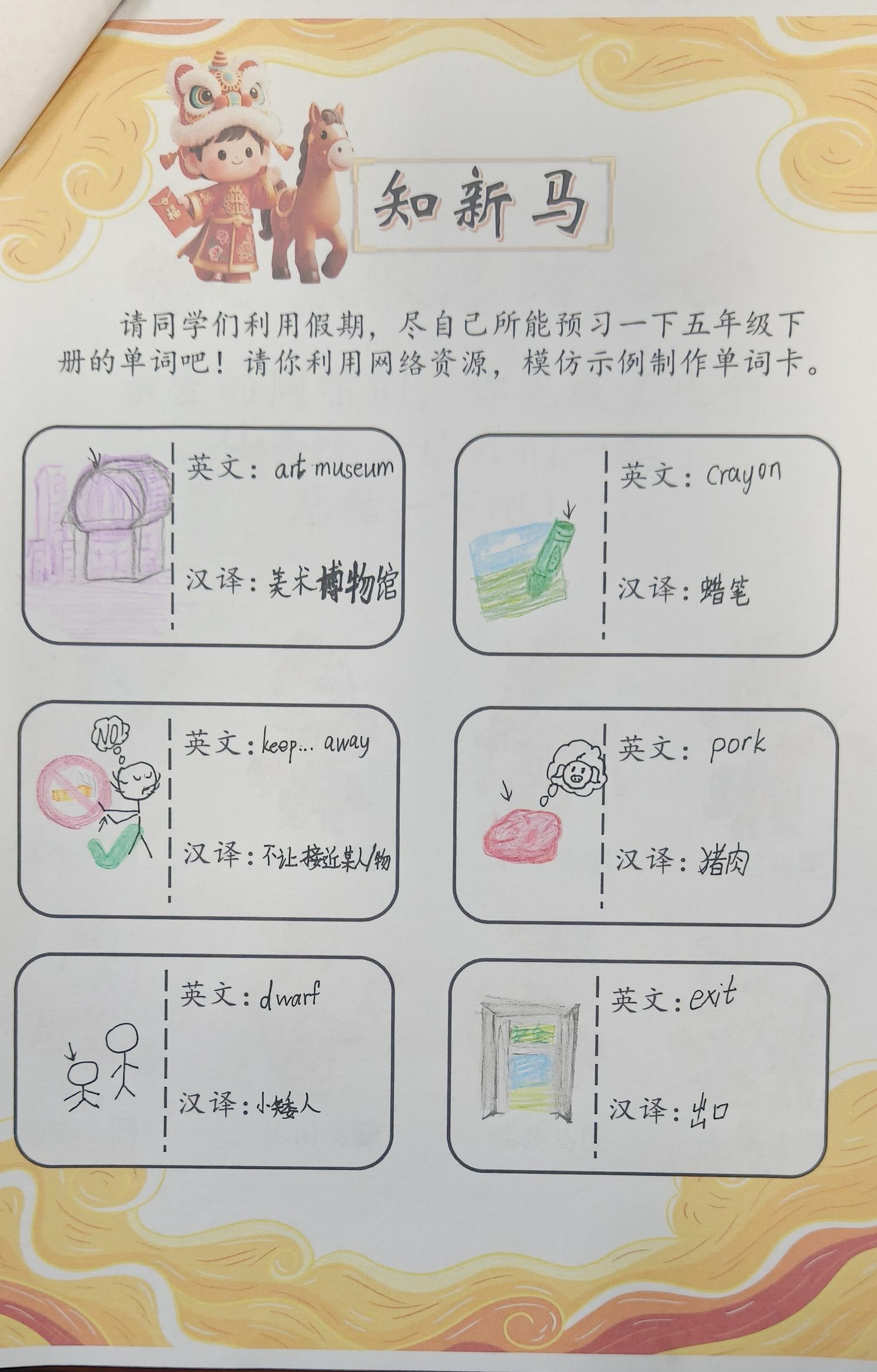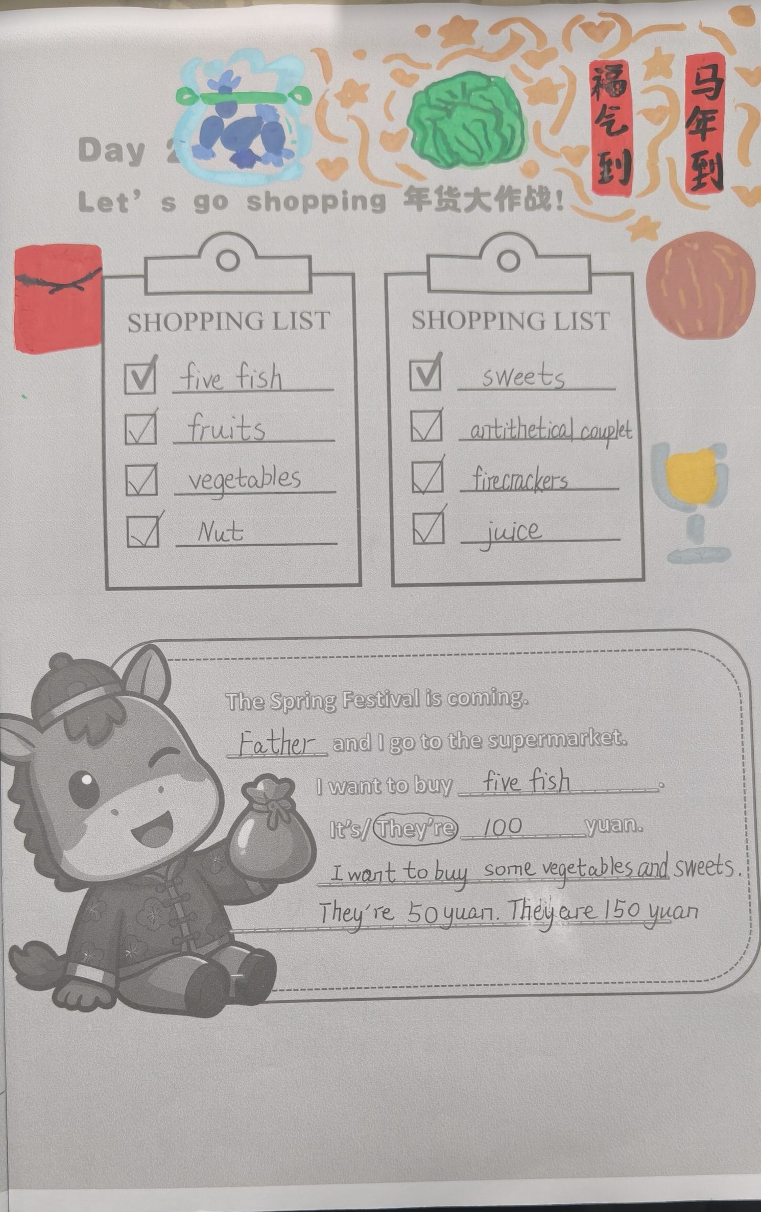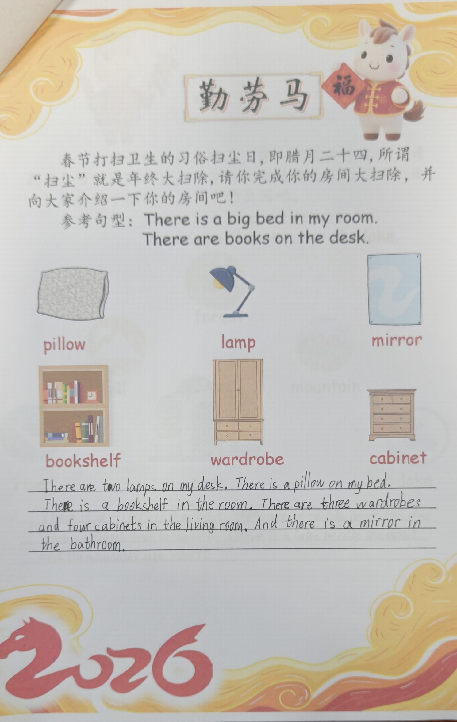 英语作业则聚焦“用英语讲好中国年”主题,借助介绍家庭树、模拟“年货大作战”采购场景运用购物用语,用英语描述年夜饭、开展春节习俗采访等活动,引导同学们在语言输出中传承中华文化,培养跨文化交际意识。