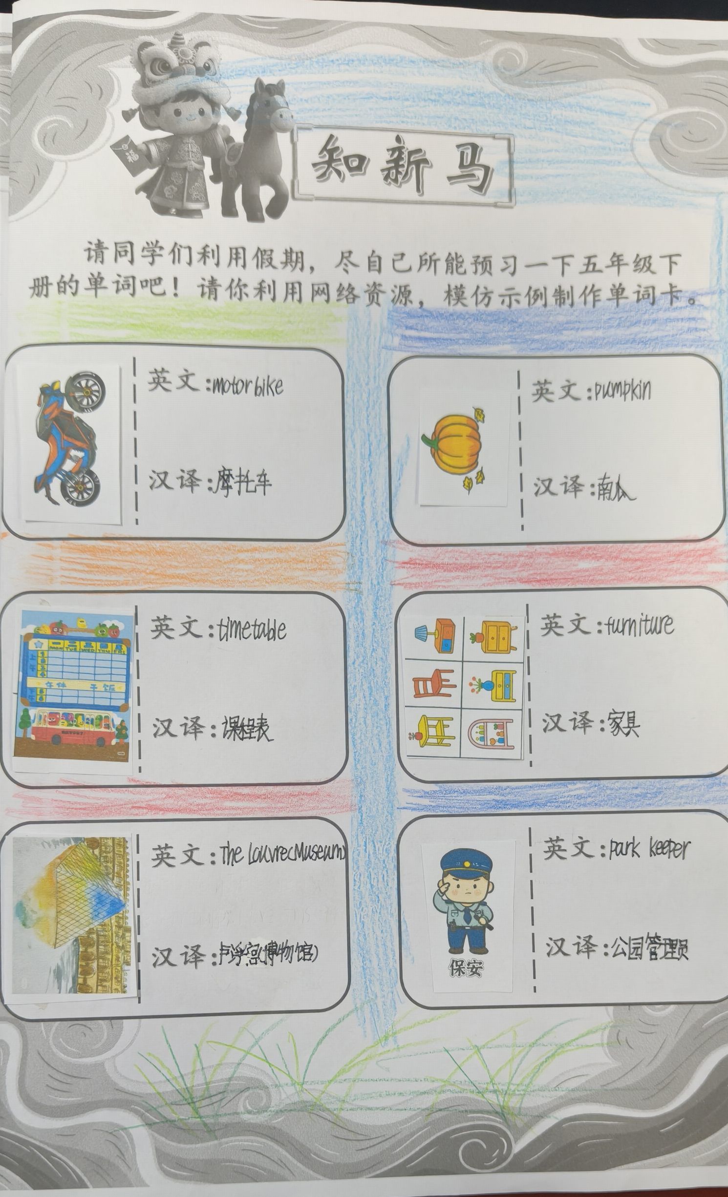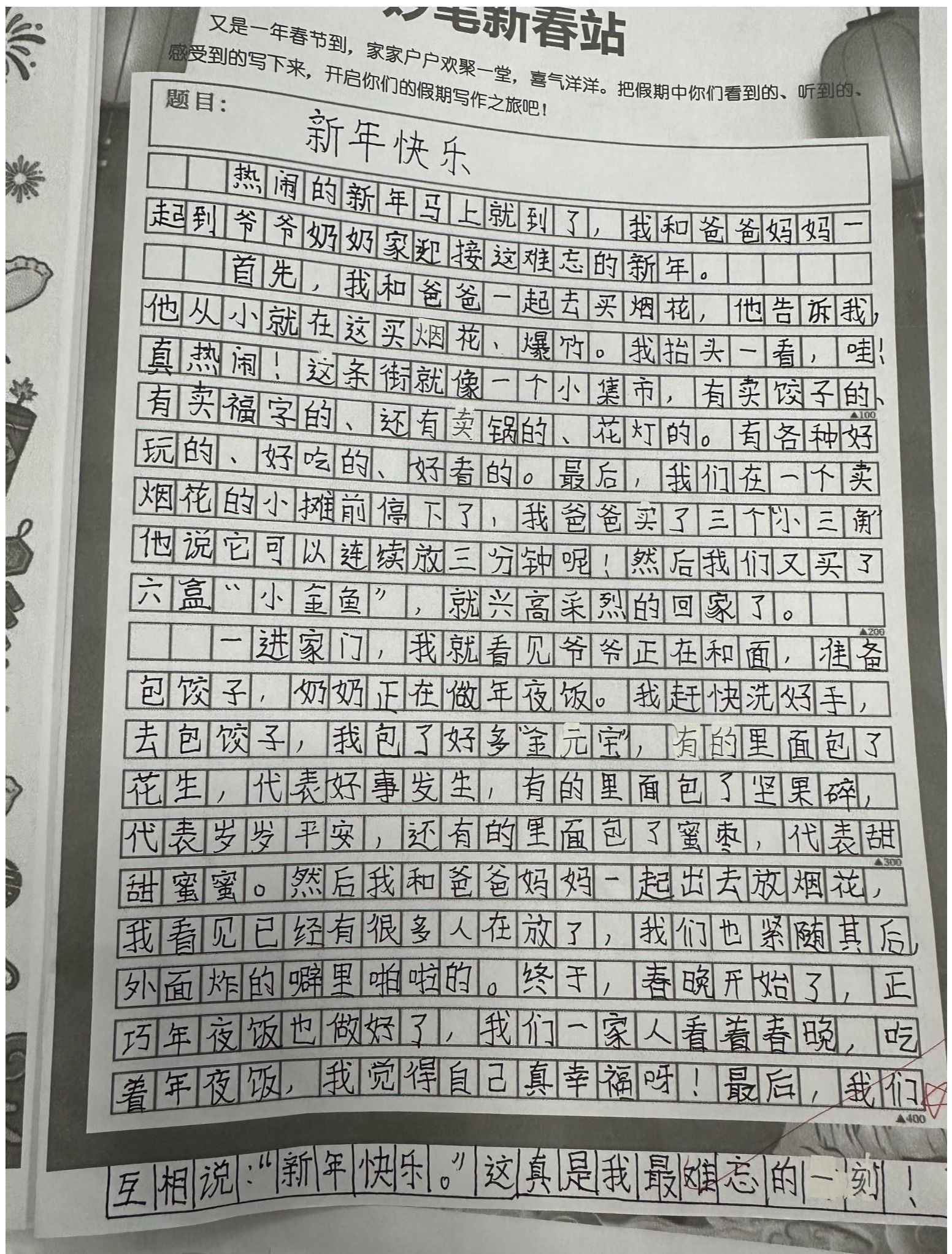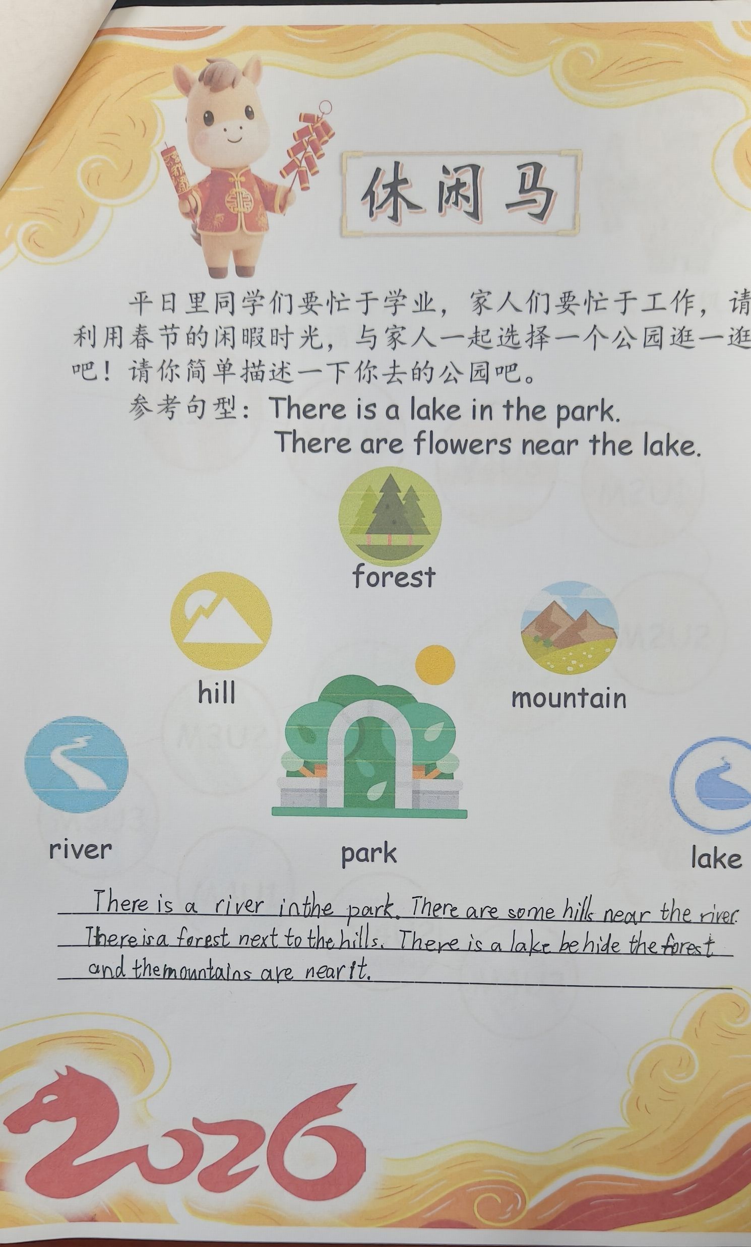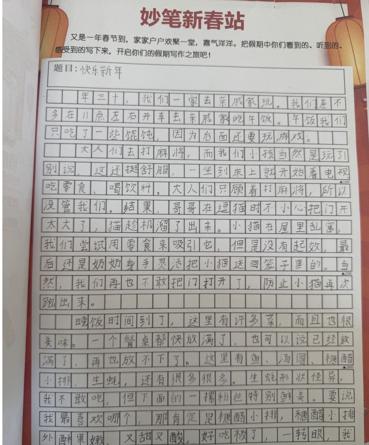 英语作业则聚焦“用英语讲好中国年”主题,借助介绍家庭树、模拟“年货大作战”采购场景运用购物用语,用英语描述年夜饭、开展春节习俗采访等活动,引导同学们在语言输出中传承中华文化,培养跨文化交际意识。