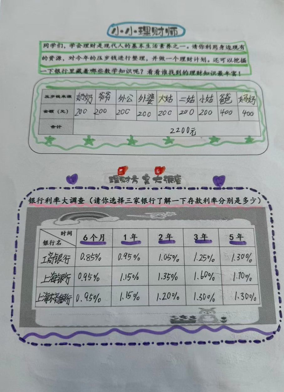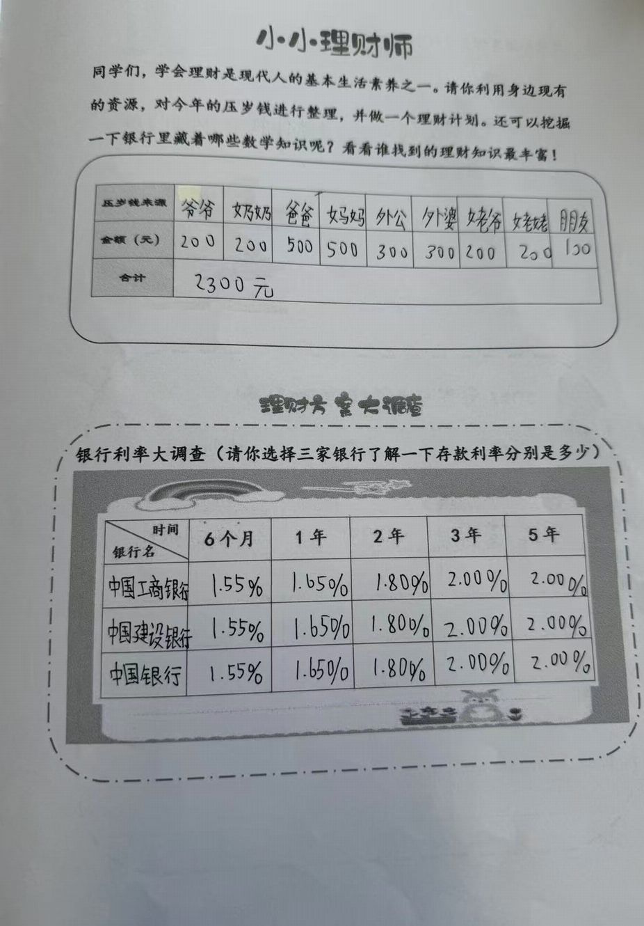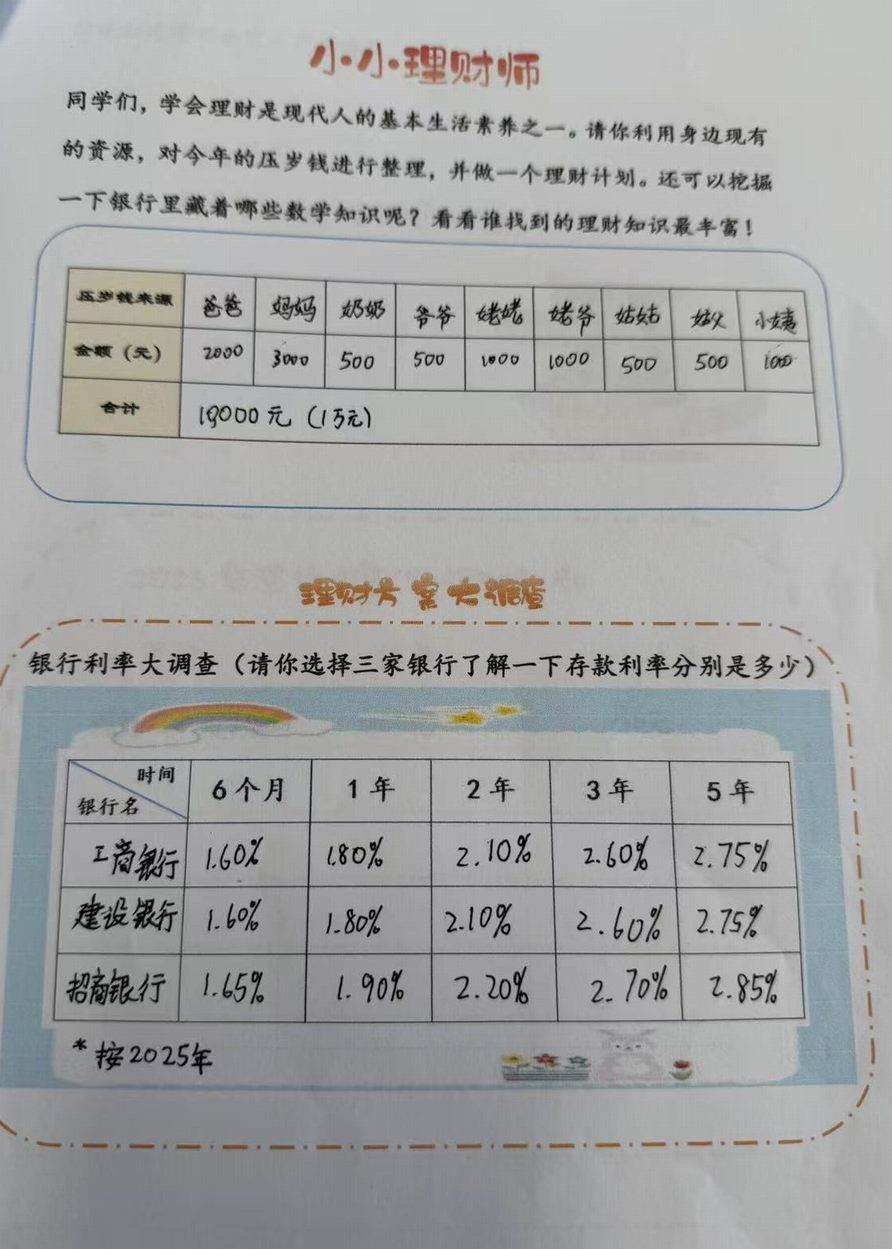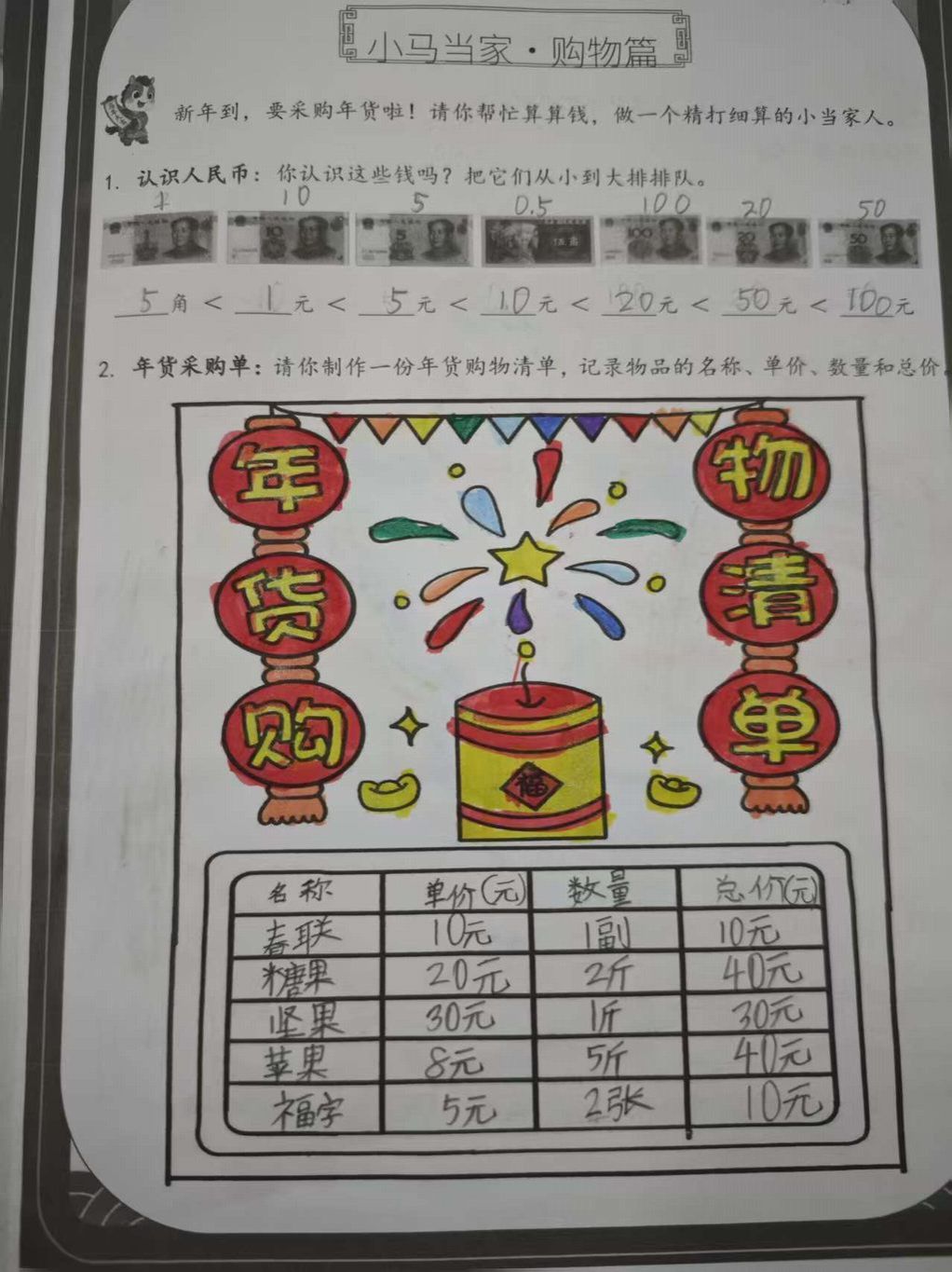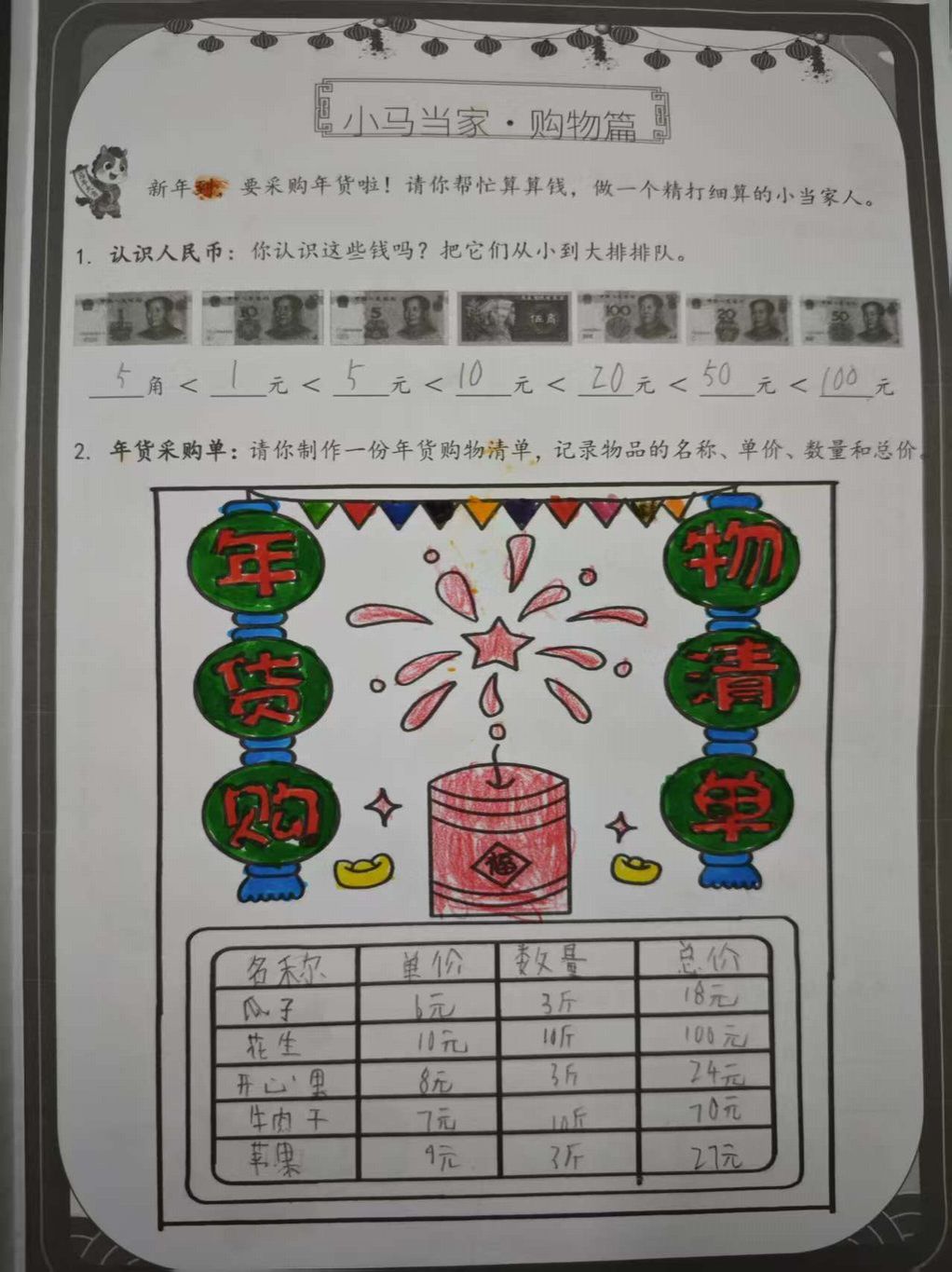 为引导同学们用数学眼光观察生活,数学作业围绕“生活中的数学”展开设计,通过采购年货、规划时间、压岁钱理财等任务,让大家在解决实际问题中提升数据整理与分析能力。