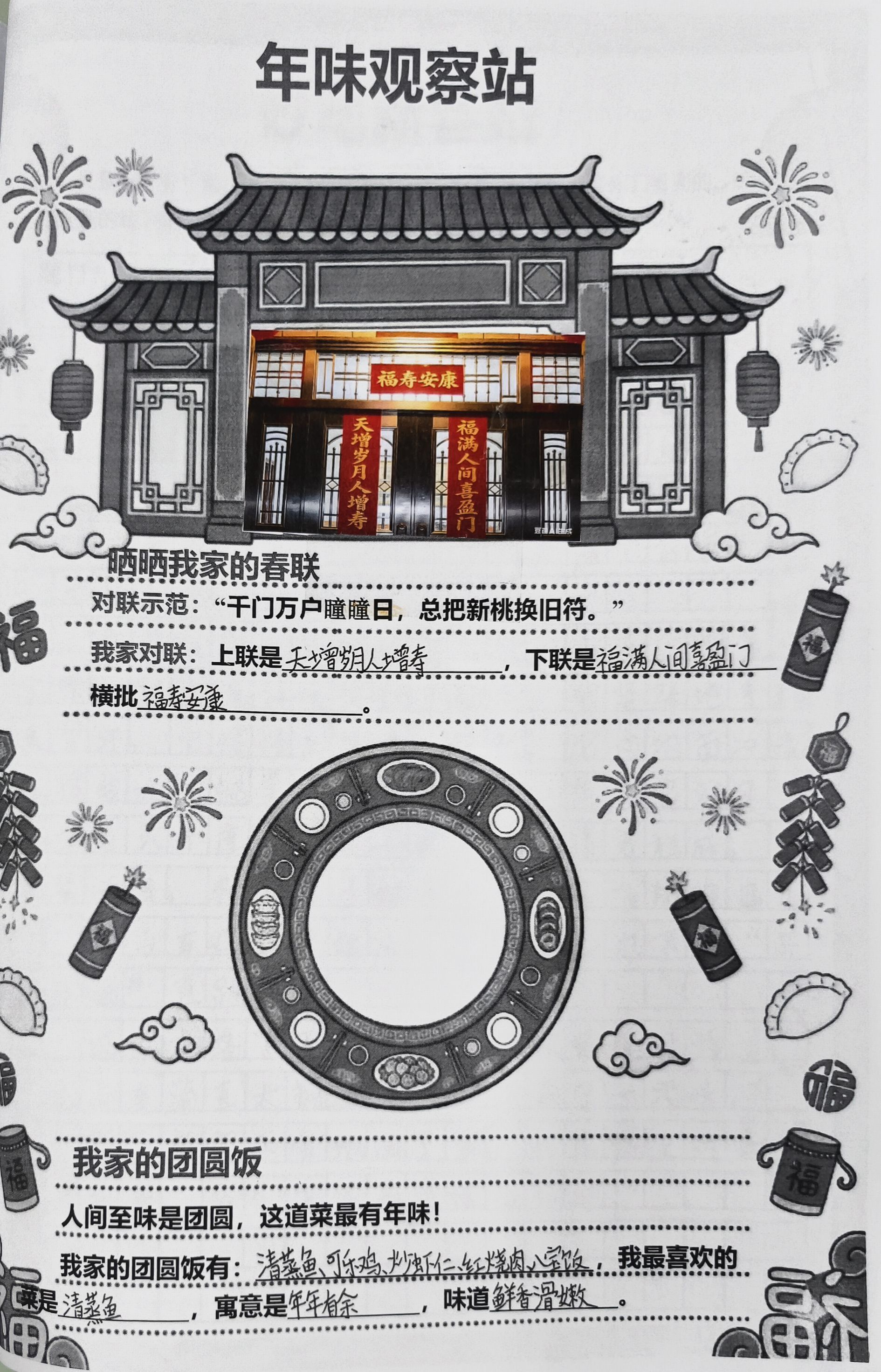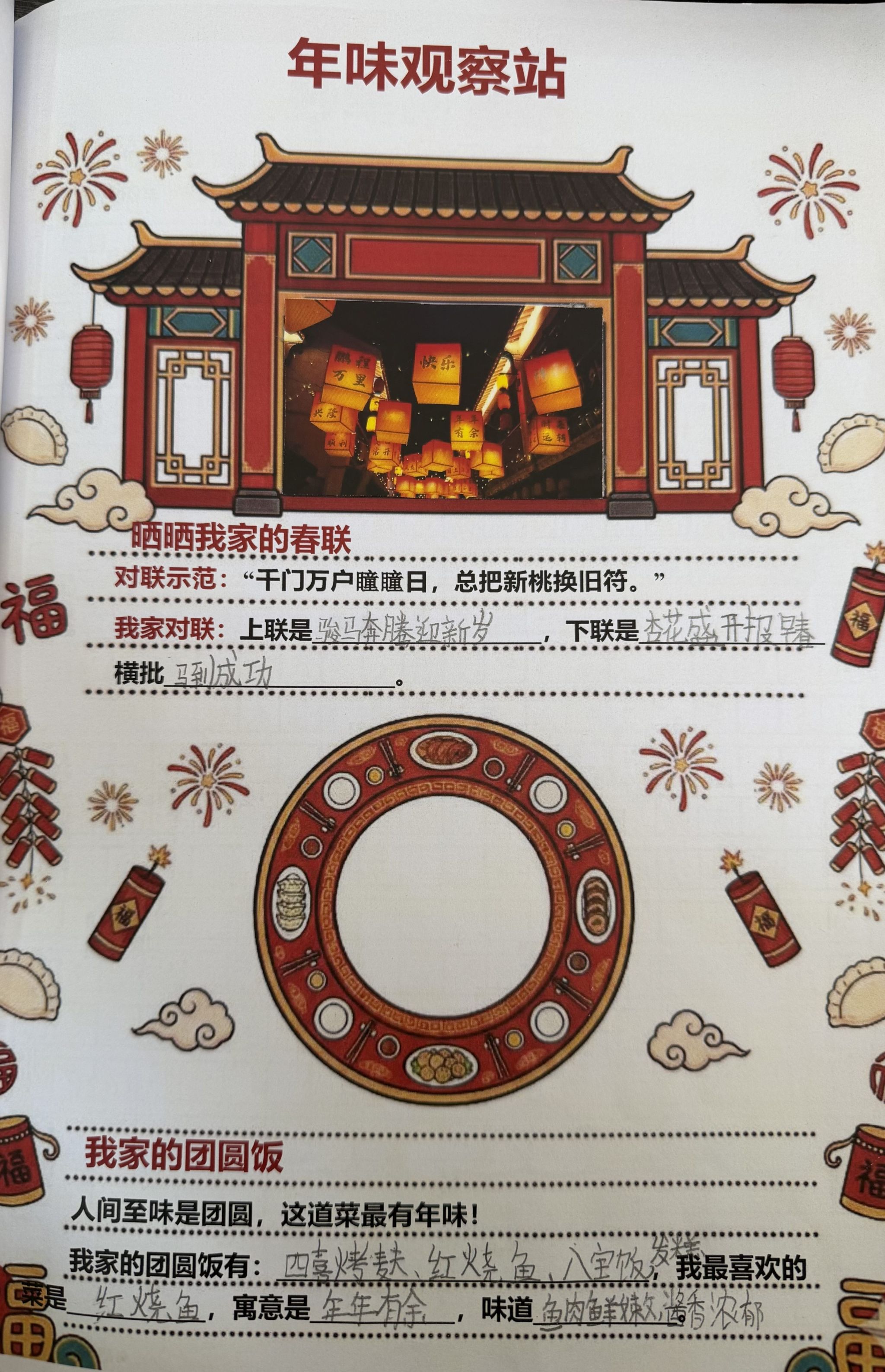 语文作业围绕“年味里的语文”设计了富有特色的实践活动,将语言学习与春节文化深度融合。孩子们记录春联、讲述年俗、品读经典,在实践中感受传统文化魅力,在表达中慢慢积累文化知识,在传承中积淀文化底蕴。