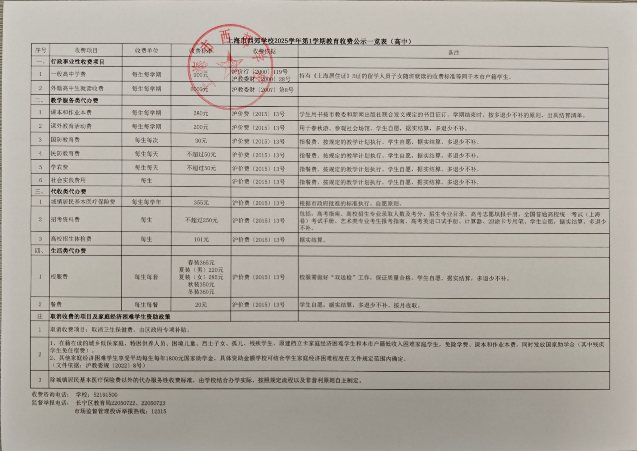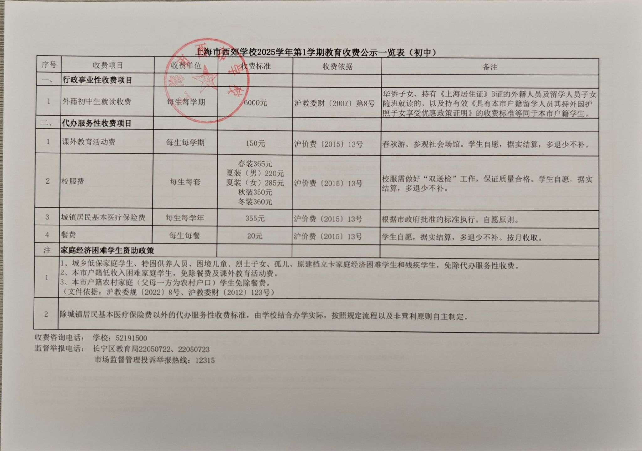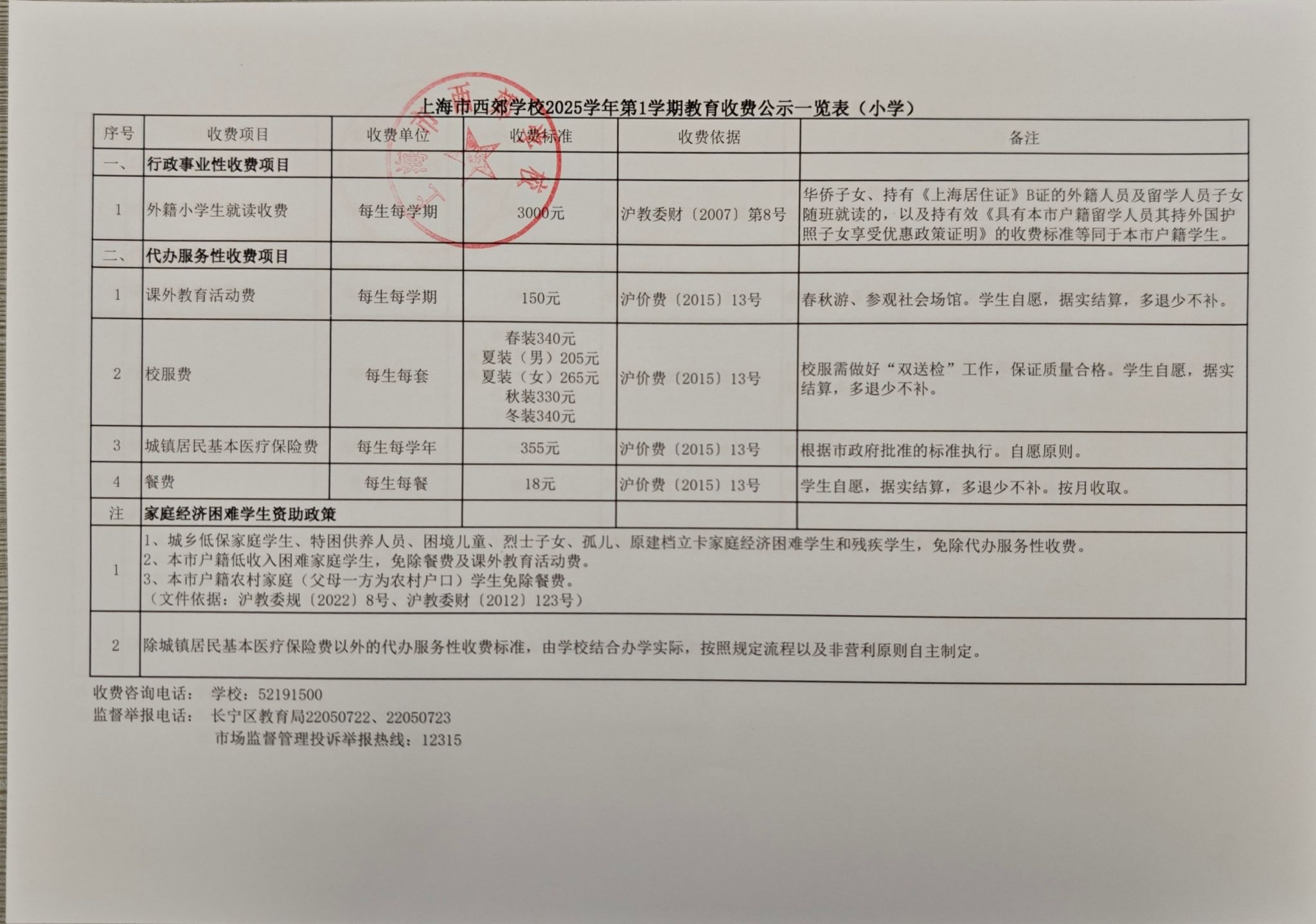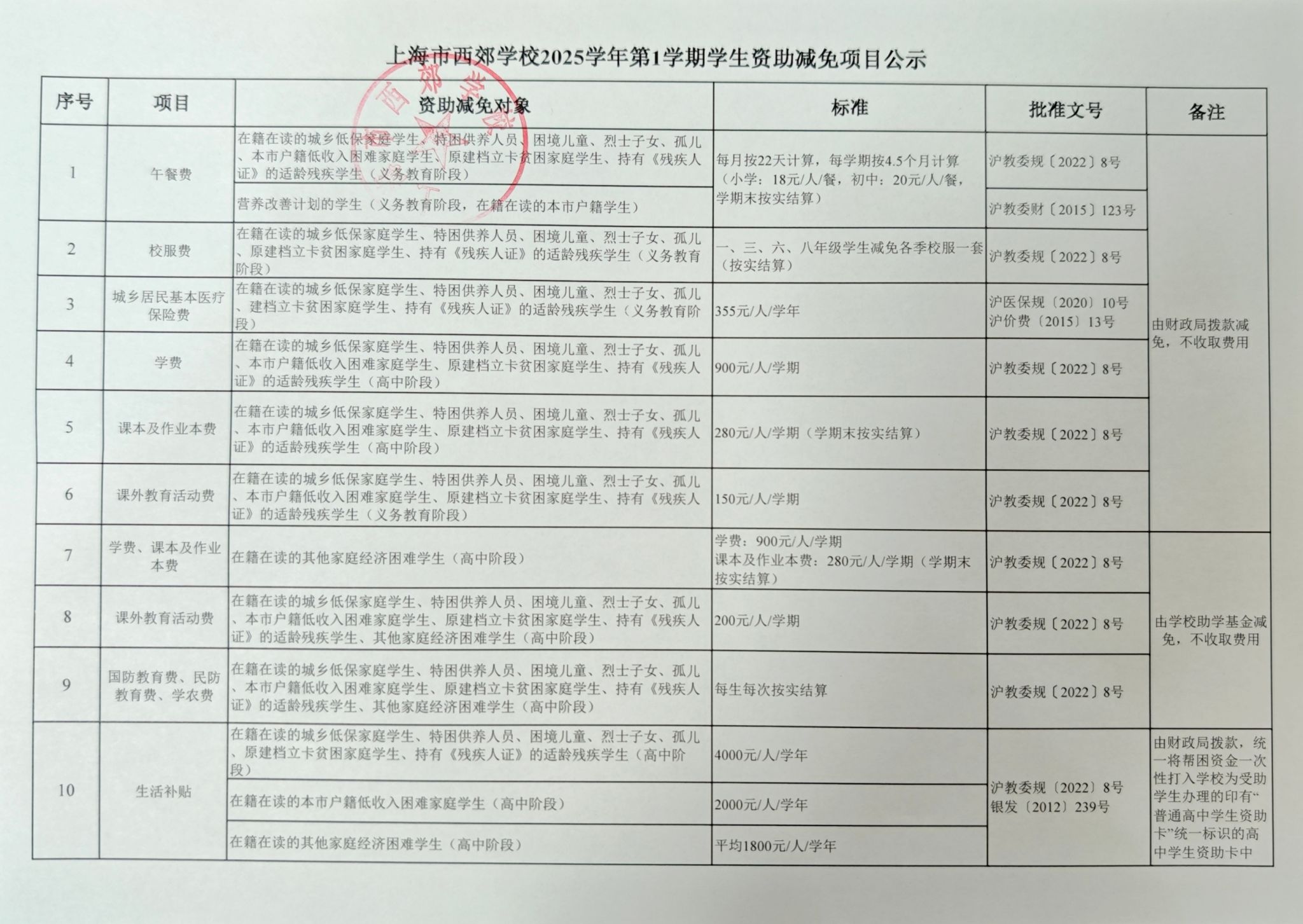 上海市西郊学校2025学年第1学期收费及学生资助减免项目公示