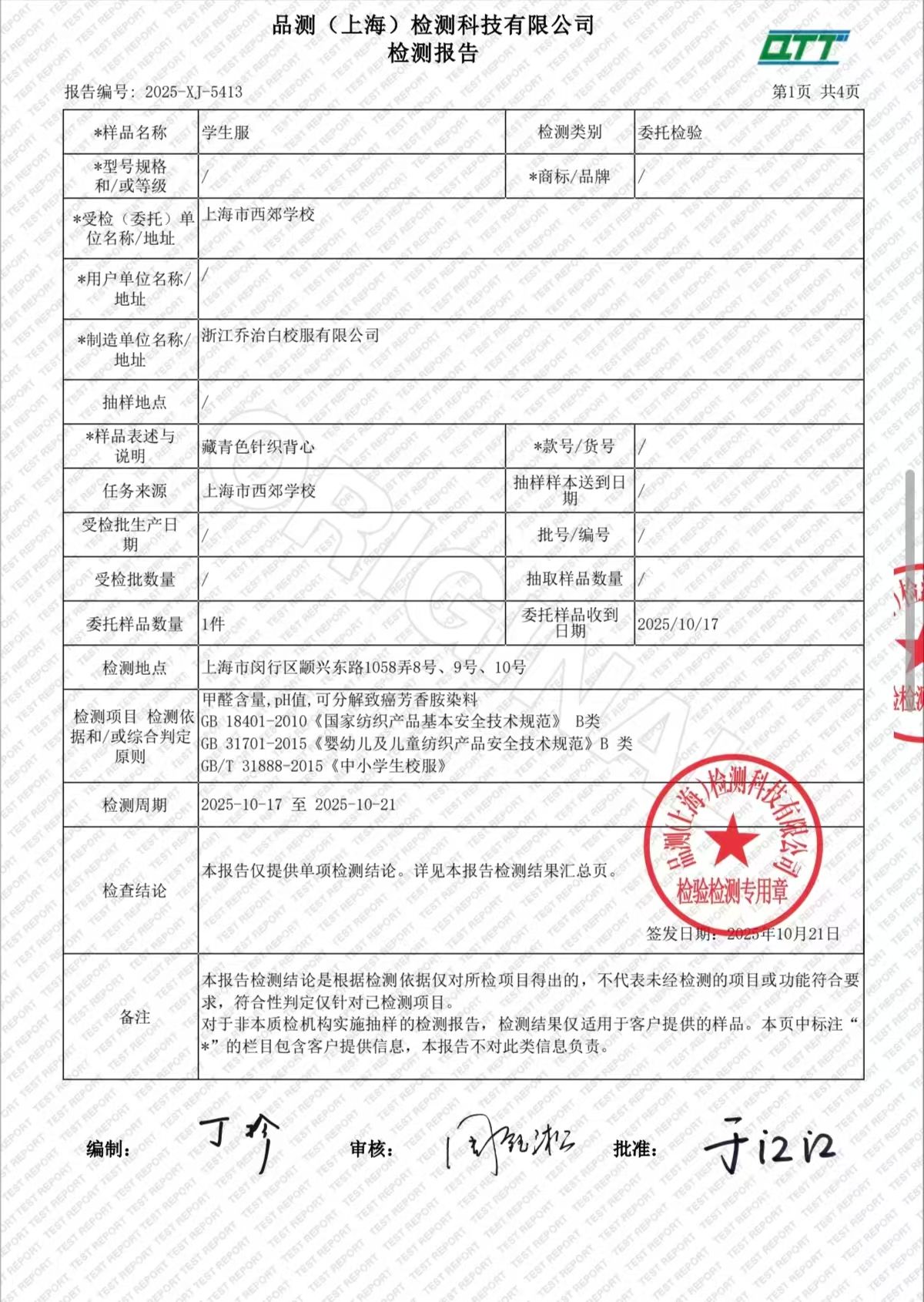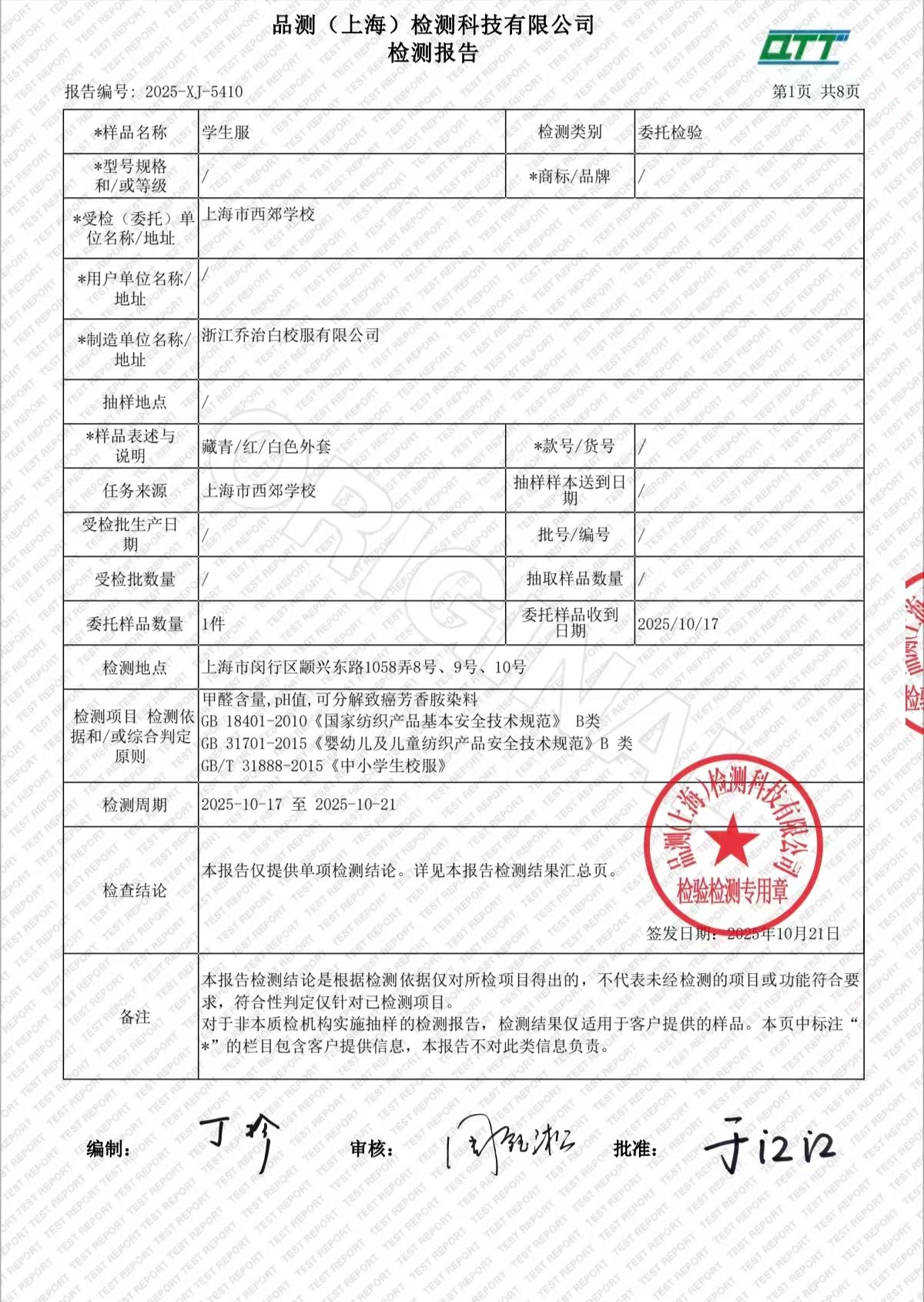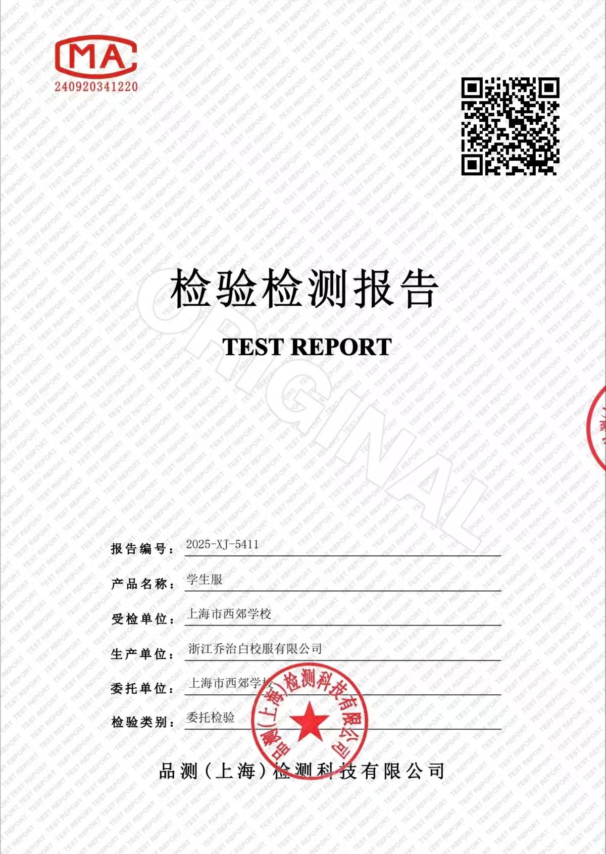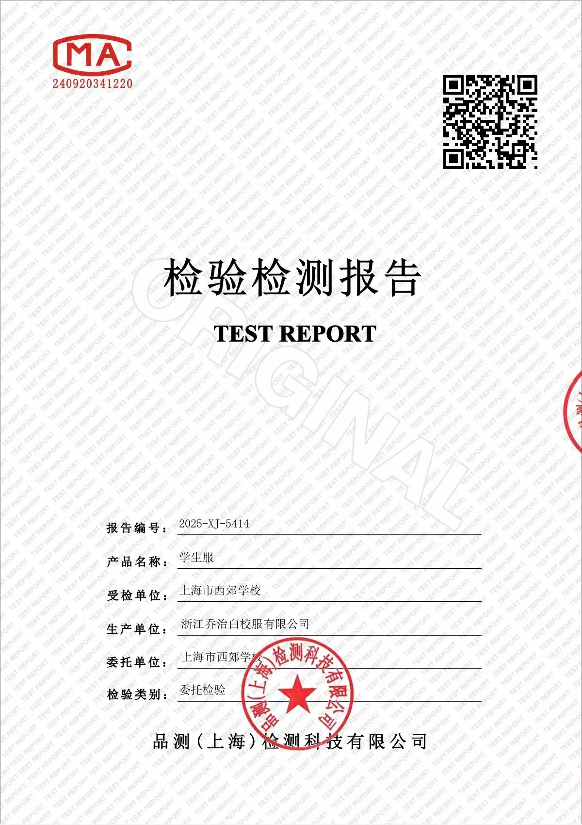 2025学年上海市西郊学校春夏校服检测报告公示